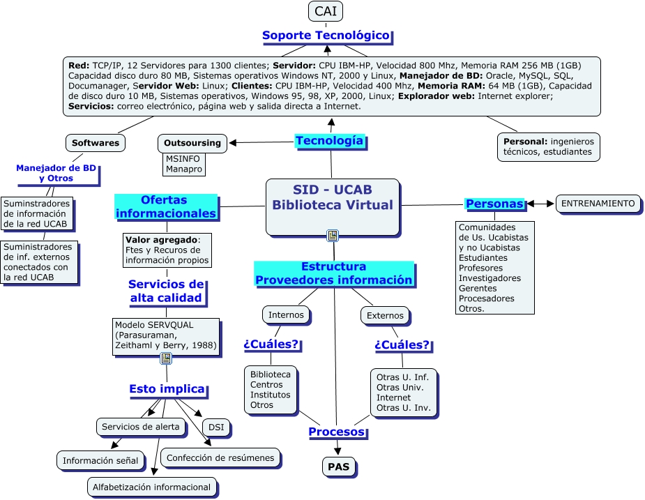 Estructura posible, SID - UCAB Biblioteca Virtual Procesos PAS, Internos ¿Cuáles? Biblioteca Centros Institutos Otros, Valor agregado: Ftes y Recuros de información propios Servicios de alta calidad Modelo SERVQUAL (Parasuraman, Zeithaml y Berry, 1988), CAI Soporte Tecnológico Softwares, Otras U. Inf. Otras Univ. Internet Otras U. Inv. Procesos PAS, ENTRENAMIENTO Personas Comunidades de Us. Ucabistas y no Ucabistas Estudiantes Profesores Investigadores Gerentes Procesadores Otros., Red: TCP/IP, 12 Servidores para 1300 clientes; Servidor: CPU IBM-HP, Velocidad 800 Mhz, Memoria RAM 256 MB (1GB) Capacidad disco duro 80 MB, Sistemas operativos Windows NT, 2000 y Linux, Manejador de BD: Oracle, MySQL, SQL, Documanager, Servidor Web: Linux; Clientes: CPU IBM-HP, Velocidad 400 Mhz, Memoria RAM: 64 MB (1GB), Capacidad de disco duro 10 MB, Sistemas operativos, Windows 95, 98, XP, 2000, Linux; Explorador web: Internet explorer; Servicios: correo electrónico, página web y salida directa a Internet. Soporte Tecnológico Personal: ingenieros técnicos, estudiantes, SID - UCAB Biblioteca Virtual Estructura Proveedores información Internos, Modelo SERVQUAL (Parasuraman, Zeithaml y Berry, 1988) Esto implica Alfabetización informacional, SID - UCAB Biblioteca Virtual Tecnología Red: TCP/IP, 12 Servidores para 1300 clientes; Servidor: CPU IBM-HP, Velocidad 800 Mhz, Memoria RAM 256 MB (1GB) Capacidad disco duro 80 MB, Sistemas operativos Windows NT, 2000 y Linux, Manejador de BD: Oracle, MySQL, SQL, Documanager, Servidor Web: Linux; Clientes: CPU IBM-HP, Velocidad 400 Mhz, Memoria RAM: 64 MB (1GB), Capacidad de disco duro 10 MB, Sistemas operativos, Windows 95, 98, XP, 2000, Linux; Explorador web: Internet explorer; Servicios: correo electrónico, página web y salida directa a Internet.