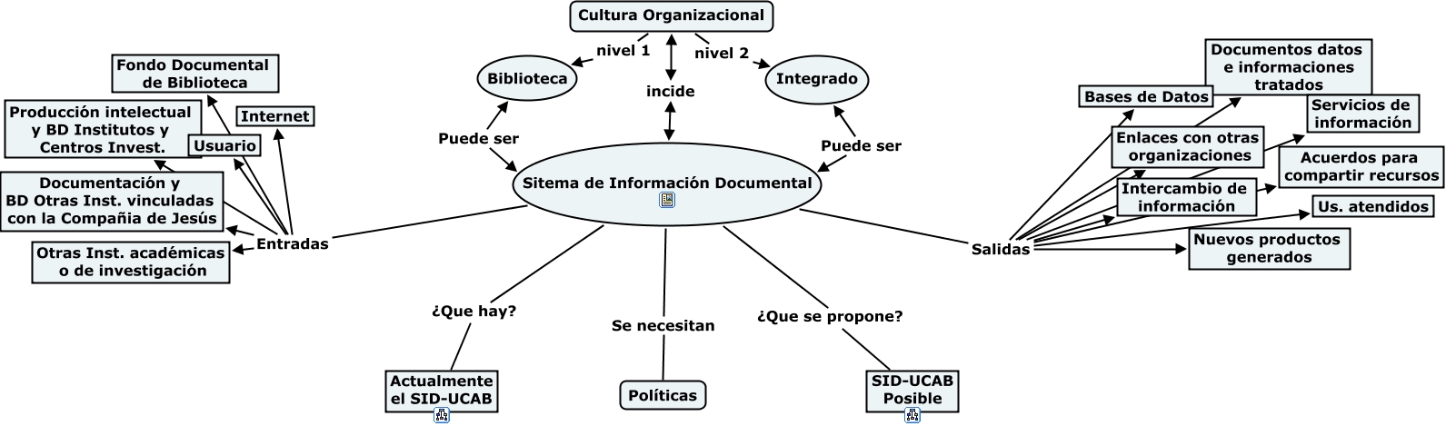 SistInfDocUCAB, Sitema de Información Documental Salidas Documentos datos e informaciones tratados, Sitema de Información Documental Se necesitan Políticas, Sitema de Información Documental Entradas Internet, Cultura Organizacional incide Sitema de Información Documental, Sitema de Información Documental Salidas Nuevos productos generados, Cultura Organizacional nivel 1 Biblioteca, Sitema de Información Documental Salidas Us. atendidos, Cultura Organizacional nivel 2 Integrado, Sitema de Información Documental Salidas Servicios de información, Sitema de Información Documental Salidas Intercambio de información