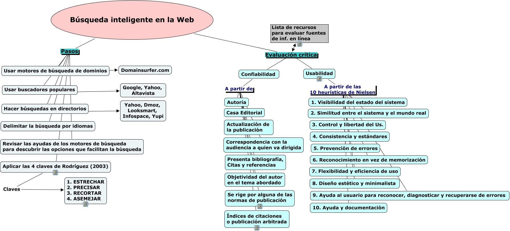 Busq Inteligente en Web, Búsqueda inteligente en la Web Pasos Delimitar la búsqueda por idiomas, Hacer búsquedas en directorios ???? Yahoo, Dmoz, Looksmart, Infospace, Yupi, Usabilidad A partir de las 10 heurísticas de Nielsen 2. Similitud entre el sistema y el mundo real, Usabilidad A partir de las 10 heurísticas de Nielsen 6. Reconocimiento en vez de memorización, Usabilidad A partir de las 10 heurísticas de Nielsen 5. Prevención de errores, Búsqueda inteligente en la Web Pasos Usar buscadores populares, Usabilidad A partir de las 10 heurísticas de Nielsen 3. Control y libertad del Us., Confiabilidad A partir de Casa Editorial, Búsqueda inteligente en la Web Evaluación crítica Confiabilidad, Confiabilidad A partir de Índices de citaciones o publicación arbitrada