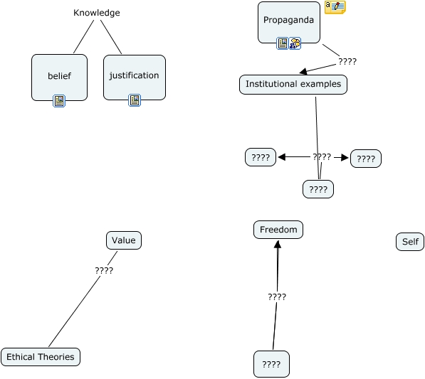 This Concept Map, created with IHMC CmapTools, has information related to: intro1, Institutional examples ???? ????, Freedom ???? ????, Value ???? Ethical Theories, ???? ???? ????, Propaganda ???? Institutional examples, Freedom ???? ????, belief Knowledge justification, ???? ???? ????