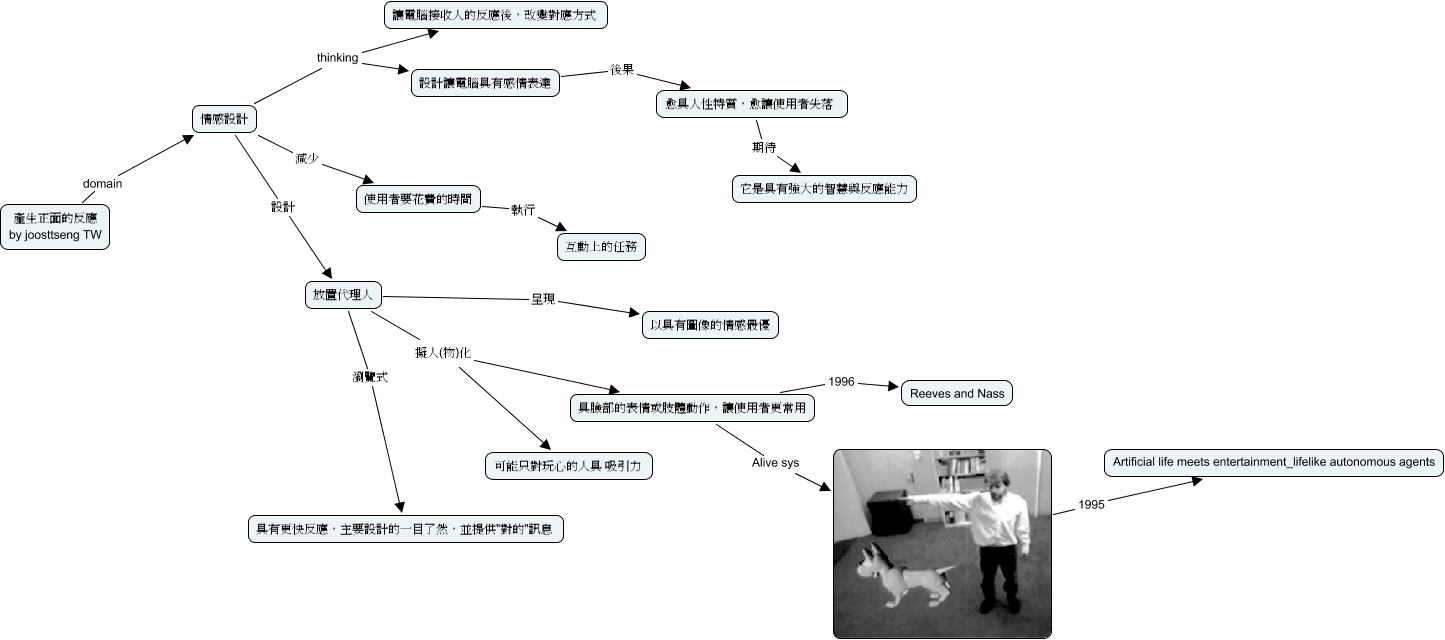 This Concept Map has information related to: 產生正面的反應-互動設計, 情感設計 減少 使用者要花費的時間, 放置代理人 擬人(物)化 可能只對玩心的人具 吸引力, 產生正面的反應 by joosttseng TW domain 情感設計, 情感設計 thinking 讓電腦接收人的反應後,改變對應方式, 愈具人性特質,愈讓使用者失落 期待 它是具有強大的智慧與反應能力, 使用者要花費的時間 執行 互動上的任務, 具臉部的表情或肢體動作,讓使用者更常用 Alive sys , 情感設計 thinking 設計讓電腦具有感情表達, 放置代理人 瀏覽式 具有更快反應,主要設計的一目了然,並提供"對的"訊息, 放置代理人 擬人(物)化 具臉部的表情或肢體動作,讓使用者更常用