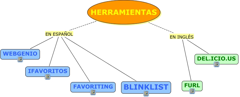 Este mapa conceptual tiene información relacionada a: HERRAMIENTAS, HERRAMIENTAS EN ESPAÑOL FAVORITING, HERRAMIENTAS EN INGLÉS FURL, HERRAMIENTAS EN ESPAÑOL BLINKLIST, HERRAMIENTAS EN ESPAÑOL IFAVORITOS, HERRAMIENTAS EN INGLÉS DEL.ICIO.US, HERRAMIENTAS EN ESPAÑOL WEBGENIO