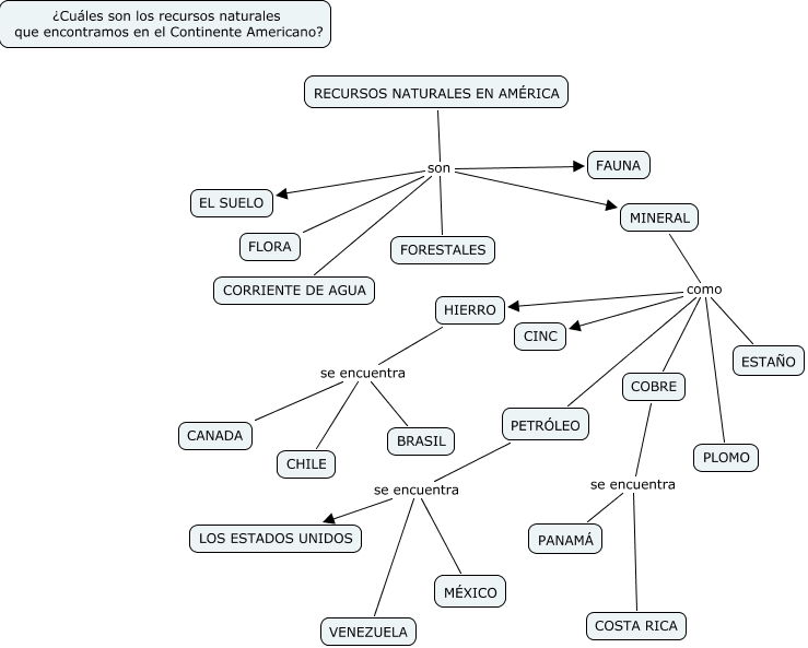 RECURSOS NATURALES ORTEGA SAIDE, MINERAL como ESTAÑO, HIERRO se encuentra CANADA, RECURSOS NATURALES EN AMÉRICA son FORESTALES, RECURSOS NATURALES EN AMÉRICA son CORRIENTE DE AGUA, PETRÓLEO se encuentra LOS ESTADOS UNIDOS, RECURSOS NATURALES EN AMÉRICA son FLORA, COBRE se encuentra PANAMÁ, MINERAL como CINC, PETRÓLEO se encuentra VENEZUELA, COBRE se encuentra COSTA RICA