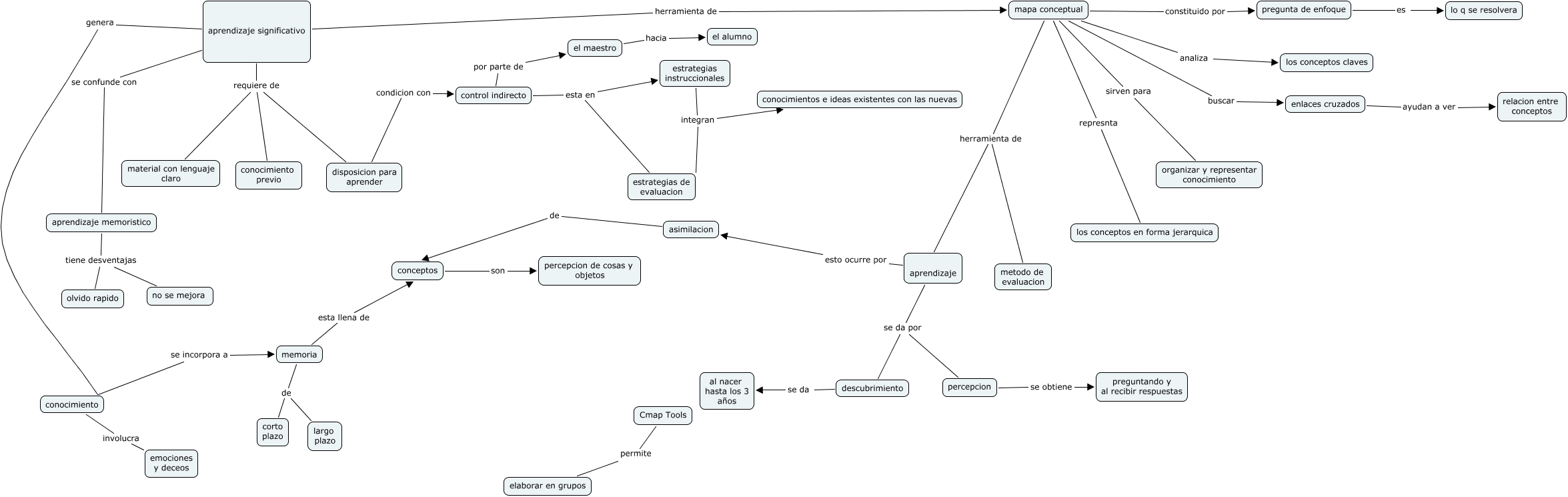 Este mapa conceptual tiene información relacionada a: aprendizaje significativo, aprendizaje significativo requiere de disposicion para aprender, mapa conceptual sirven para organizar y representar conocimiento, asimilacion de conceptos, aprendizaje esto ocurre por asimilacion, aprendizaje significativo genera conocimiento, aprendizaje se da por descubrimiento, control indirecto por parte de el maestro, el maestro hacia el alumno, memoria de largo plazo, enlaces cruzados ayudan a ver relacion entre conceptos
