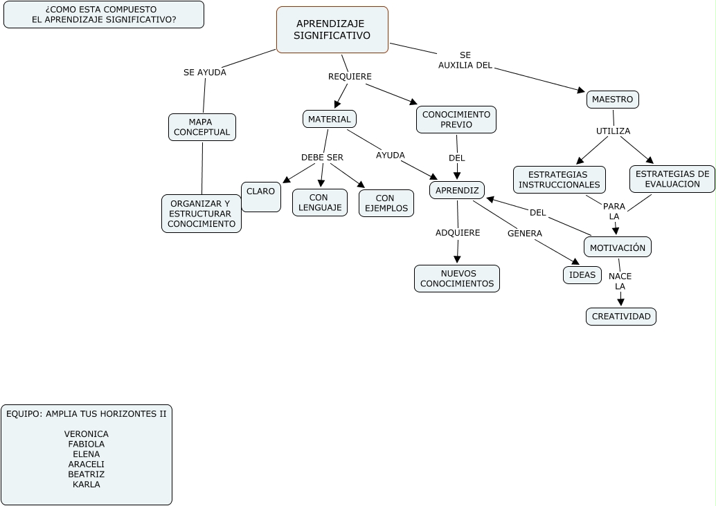 This Concept Map, created with IHMC CmapTools, has information related to: mapa equipo+equipo, APRENDIZAJE SIGNIFICATIVO SE AYUDA MAPA CONCEPTUAL, APRENDIZ GENERA IDEAS, APRENDIZAJE SIGNIFICATIVO SE AUXILIA DEL MAESTRO, ESTRATEGIAS INSTRUCCIONALES PARA LA MOTIVACIÓN, MAESTRO UTILIZA ESTRATEGIAS DE EVALUACION, ESTRATEGIAS DE EVALUACION PARA LA MOTIVACIÓN, APRENDIZ ADQUIERE NUEVOS CONOCIMIENTOS, MAPA CONCEPTUAL SIRVE ORGANIZAR Y ESTRUCTURAR CONOCIMIENTO, MOTIVACIÓN DEL APRENDIZ, MATERIAL DEBE SER CON LENGUAJE, MOTIVACIÓN NACE LA CREATIVIDAD, CONOCIMIENTO PREVIO DEL APRENDIZ, MATERIAL DEBE SER CLARO, APRENDIZAJE SIGNIFICATIVO REQUIERE CONOCIMIENTO PREVIO, APRENDIZAJE SIGNIFICATIVO REQUIERE MATERIAL, MAESTRO UTILIZA ESTRATEGIAS INSTRUCCIONALES, MATERIAL DEBE SER CON EJEMPLOS, MATERIAL AYUDA APRENDIZ