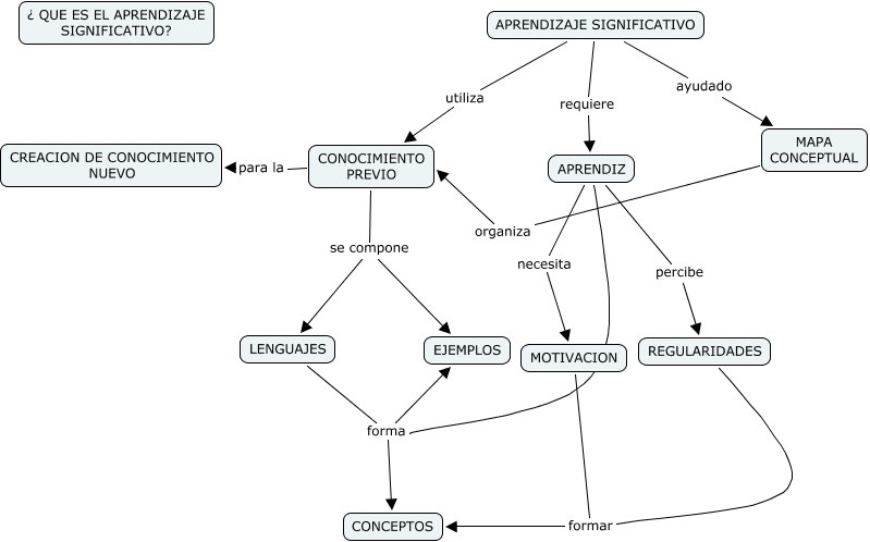 Este mapa conceptual tiene información relacionada a: mapa individual, APRENDIZAJE SIGNIFICATIVO utiliza CONOCIMIENTO PREVIO, REGULARIDADES formar CONCEPTOS, APRENDIZ necesita MOTIVACION, CONOCIMIENTO PREVIO se compone LENGUAJES, APRENDIZ forma EJEMPLOS, CONOCIMIENTO PREVIO para la CREACION DE CONOCIMIENTO NUEVO, APRENDIZ percibe REGULARIDADES, APRENDIZAJE SIGNIFICATIVO requiere APRENDIZ, MOTIVACION formar CONCEPTOS, APRENDIZ forma CONCEPTOS