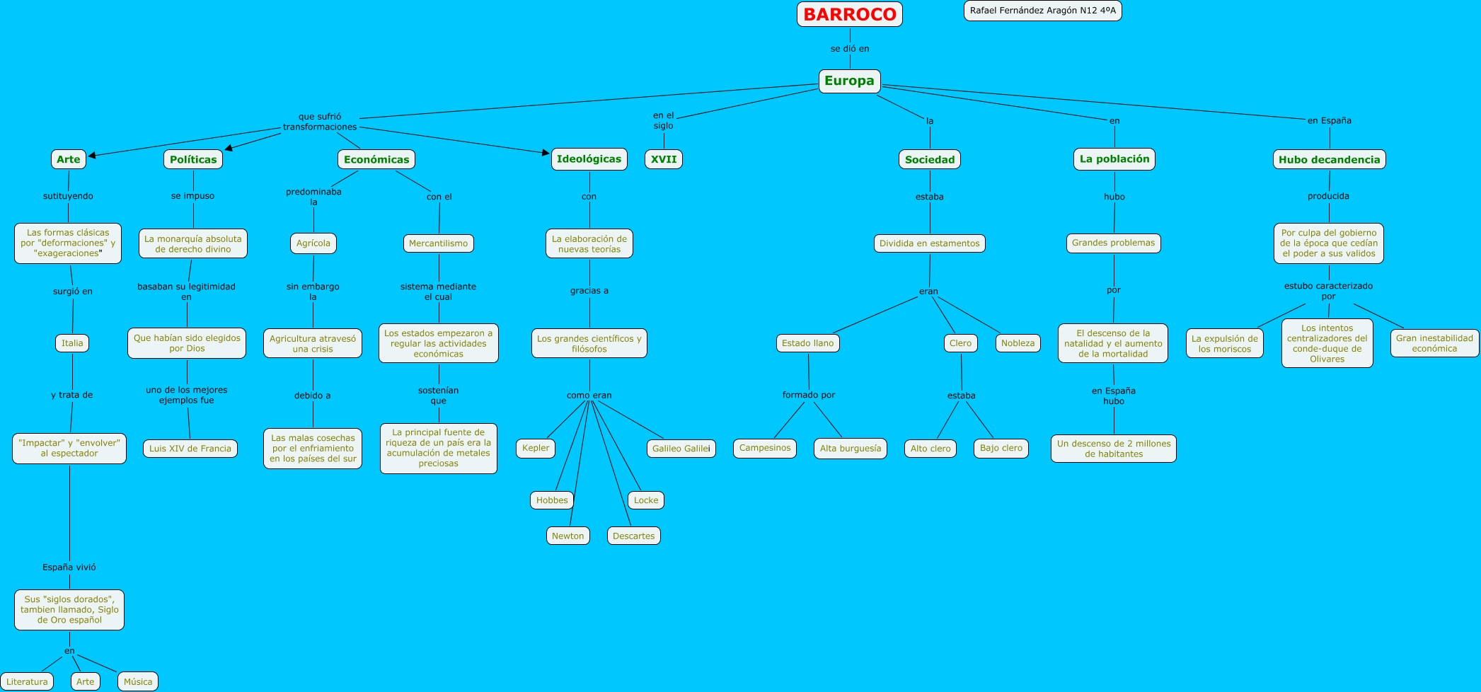Este mapa conceptual tiene información relacionada a: Barroco-Rafael Fernández, Agricultura atravesó una crisis debido a Las malas cosechas por el enfriamiento en los países del sur, Los grandes científicos y filósofos como eran Galileo Galilei, La elaboración de nuevas teorías gracias a Los grandes científicos y filósofos, Los grandes científicos y filósofos como eran Locke, Sociedad estaba Dividida en estamentos, Europa en La población, Por culpa del gobierno de la época que cedían el poder a sus validos estubo caracterizado por Gran inestabilidad económica, Hubo decandencia producida Por culpa del gobierno de la época que cedían el poder a sus validos, Arte sutituyendo Las formas clásicas por "deformaciones" y "exageraciones", Grandes problemas por El descenso de la natalidad y el aumento de la mortalidad, "Impactar" y "envolver" al espectador España vivió Sus "siglos dorados", tambien llamado, Siglo de Oro español, Ideológicas con La elaboración de nuevas teorías, Estado llano formado por Campesinos, Sus "siglos dorados", tambien llamado, Siglo de Oro español en Arte, Clero estaba Bajo clero, Europa en el siglo XVII, Los grandes científicos y filósofos como eran Hobbes, Por culpa del gobierno de la época que cedían el poder a sus validos estubo caracterizado por Los intentos centralizadores del conde-duque de Olivares, Las formas clásicas por "deformaciones" y "exageraciones" surgió en Italia, Políticas se impuso La monarquía absoluta de derecho divino