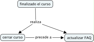Este mapa conceptual tiene información relacionada a: finalizado, finalizado el curso realiza cerrar curso, cerrar curso precede a actualizar FAQ, finalizado el curso realiza actualizar FAQ