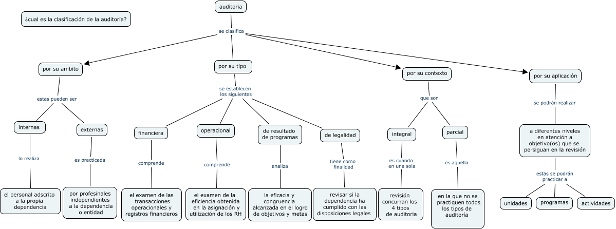 Este mapa conceptual tiene información relacionada a: TEMA LIBRE, por su tipo se establecen los siguientes de legalidad, integral es cuando en una sola revisión concurran los 4 tipos de auditoria, por su tipo se establecen los siguientes de resultado de programas, por su ambito estas pueden ser internas, de resultado de programas analiza la eficacia y congruencia alcanzada en el logro de objetivos y metas, a diferentes niveles en atención a objetivo(os) que se persiguan en la revisión estas se podrán practicar a programas, auditoria se clasifica por su ambito, a diferentes niveles en atención a objetivo(os) que se persiguan en la revisión estas se podrán practicar a unidades, por su contexto que son parcial, por su tipo se establecen los siguientes operacional