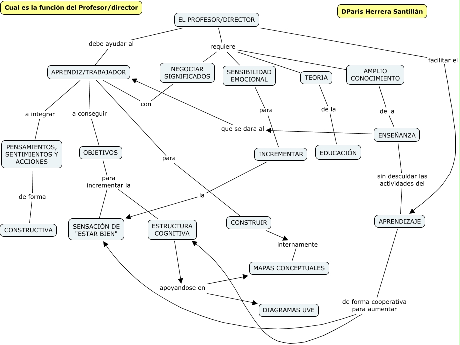 Este mapa conceptual tiene información relacionada a: Funcion del Prefesor-director, EL PROFESOR/DIRECTOR requiere SENSIBILIDAD EMOCIONAL, APRENDIZAJE de forma cooperativa para aumentar ESTRUCTURA COGNITIVA, AMPLIO CONOCIMIENTO de la ENSEÑANZA, OBJETIVOS para incrementar la SENSACIÓN DE "ESTAR BIEN", PENSAMIENTOS, SENTIMIENTOS Y ACCIONES de forma CONSTRUCTIVA, ENSEÑANZA que se dara al APRENDIZ/TRABAJADOR, EL PROFESOR/DIRECTOR requiere NEGOCIAR SIGNIFICADOS, EL PROFESOR/DIRECTOR requiere AMPLIO CONOCIMIENTO, APRENDIZ/TRABAJADOR a conseguir OBJETIVOS, EL PROFESOR/DIRECTOR requiere TEORIA