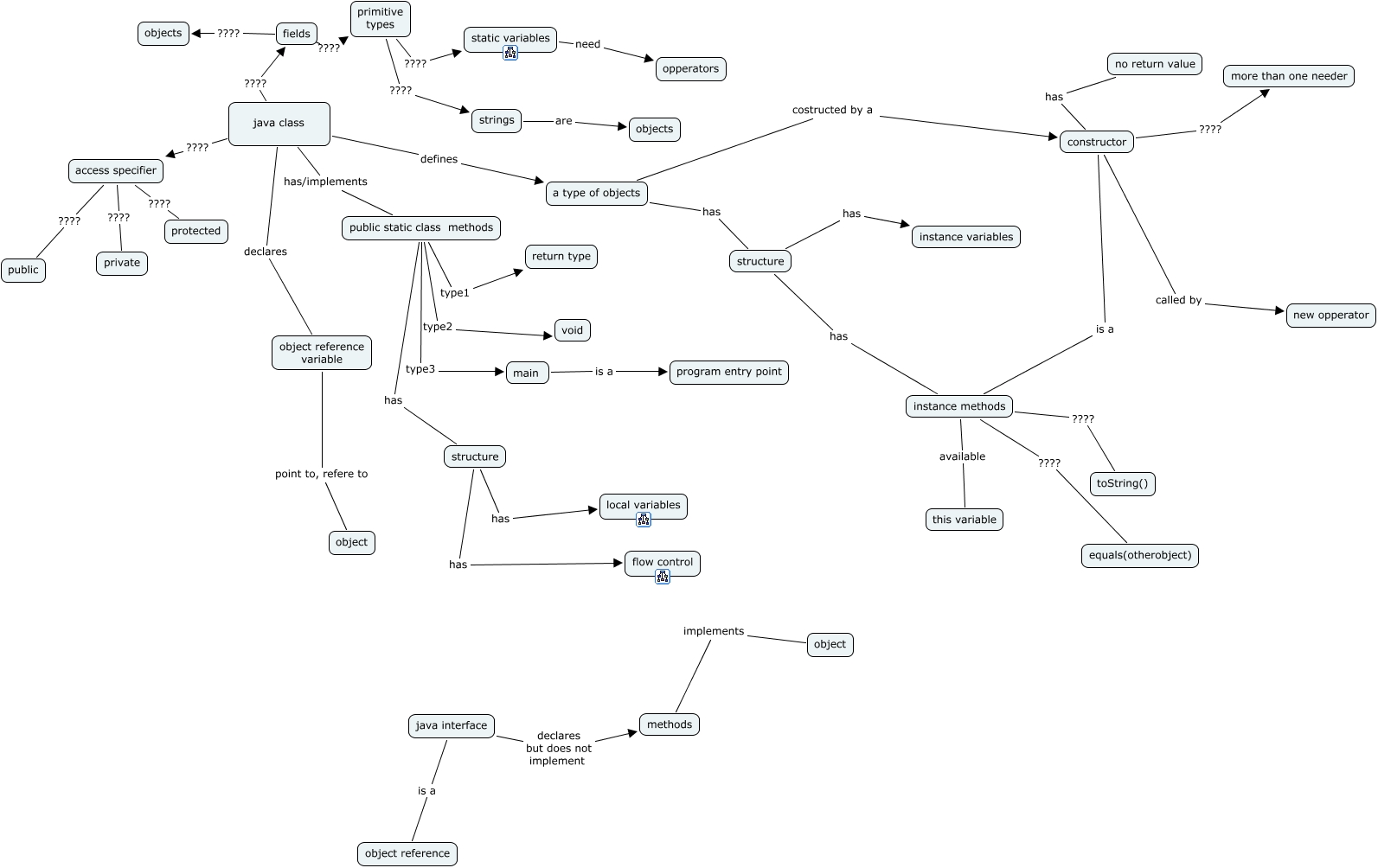 This Concept Map has information related to: java, structure has instance methods, constructor is a instance methods, constructor called by new opperator, structure has flow control, java class ???? fields, a type of objects costructed by a constructor, fields ???? objects, java class has/implements public static class methods, public static class methods type3 main, instance methods available this variable