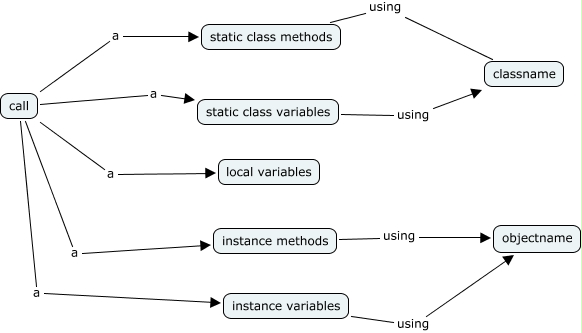 This Concept Map has information related to: call, instance variables using objectname, static class methods using classname, call a static class methods, call a local variables, call a instance methods, call a instance variables, call a static class variables, instance methods using objectname, static class variables using classname