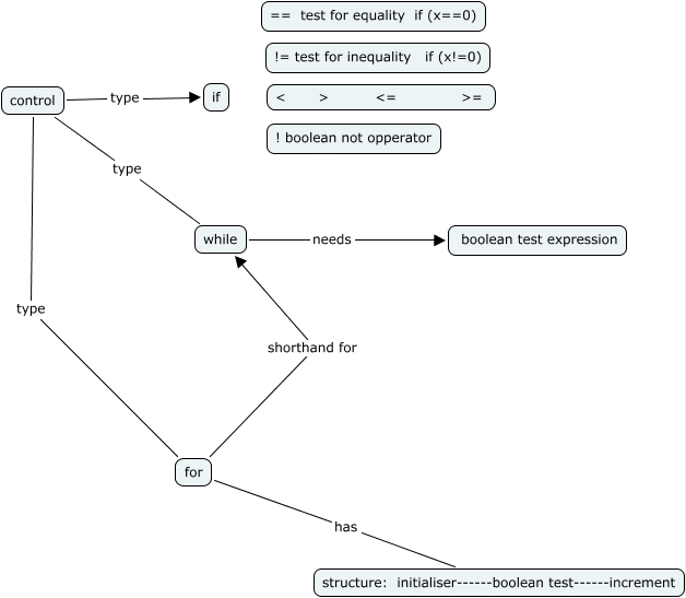 This Concept Map has information related to: control, for shorthand for while, control type for, while needs boolean test expression, control type if, control type while, for has structure: initialiser------boolean test------increment