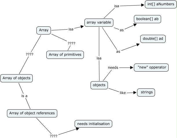 This Concept Map has information related to: array, Array isa array variable, objects like strings, Array of objects is a Array of object references, Array ???? Array of primitives, array variable as double[] ad, array variable as boolean[] ab, objects needs "new" opperator, array variable isa int[] aNumbers, array variable isa objects, Array of object references ???? needs initialisation