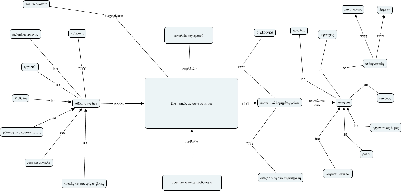 This Concept Map has information related to: phd, ιεραρχίες isa στοιχεία, Συστημικός μςτασχηματισμός ???? συστημικά δομημένη γνώση, prototype ???? συστημικά δομημένη γνώση, οργανωτικές δομές isa στοιχεία, συστημικά δομημένη γνώση ???? ανεξάρτητη απο παρατηρητή, νοητικά μοντέλα isa στοιχεία, κυβερνητικές ???? δόμηση, Μέθοδοι isa Αδόμητη γνώση, συστημική πολυμεθοδολογία συμβάλλει Συστημικός μςτασχηματισμός, νοητικά μοντέλα isa Αδόμητη γνώση