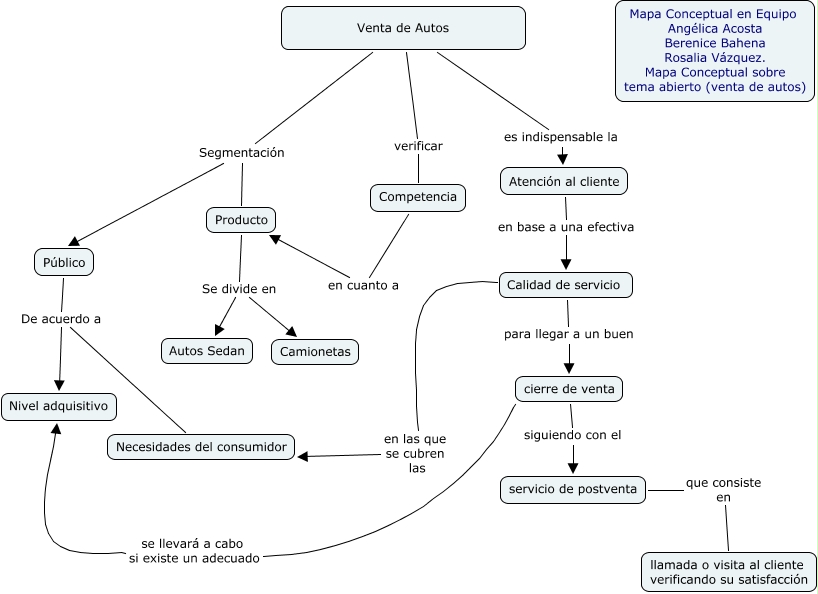 This Concept Map, created with IHMC CmapTools, has information related to: MC venta de autos (mapa en equipo Angie, Rosalia y Bere), Público De acuerdo a Nivel adquisitivo, cierre de venta se llevará a cabo si existe un adecuado Nivel adquisitivo, Competencia en cuanto a Producto, Producto Se divide en Autos Sedan, Atención al cliente en base a una efectiva Calidad de servicio, cierre de venta siguiendo con el servicio de postventa, Venta de Autos verificar Competencia, Calidad de servicio para llegar a un buen cierre de venta, Venta de Autos Segmentación Público, Venta de Autos Segmentación Producto, Venta de Autos es indispensable la Atención al cliente, Producto Se divide en Camionetas, servicio de postventa que consiste en llamada o visita al cliente verificando su satisfacción, Público De acuerdo a Necesidades del consumidor, Calidad de servicio en las que se cubren las Necesidades del consumidor
