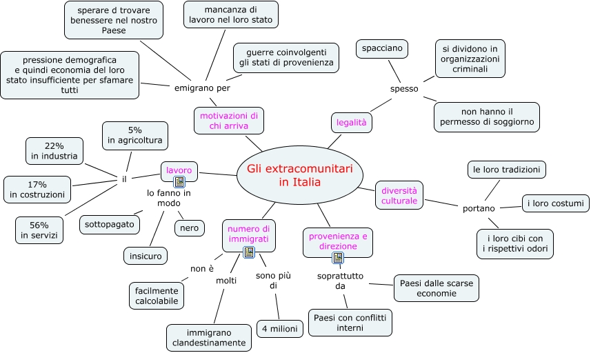 Questa Cmap, creata con IHMC CmapTools, contiene informazioni relative a: Gli extracomunitari in Italia, lavoro il 17% in costruzioni, numero di immigrati molti immigrano clandestinamente, motivazioni di chi arriva emigrano per sperare d trovare benessere nel nostro Paese, Gli extracomunitari in Italia ???? lavoro, legalità spesso si dividono in organizzazioni criminali, motivazioni di chi arriva emigrano per guerre coinvolgenti gli stati di provenienza, lavoro lo fanno in modo sottopagato, provenienza e direzione soprattutto da Paesi con conflitti interni, motivazioni di chi arriva emigrano per pressione demografica e quindi economia del loro stato insufficiente per sfamare tutti, Gli extracomunitari in Italia ???? diversità culturale, Gli extracomunitari in Italia ???? provenienza e direzione, provenienza e direzione soprattutto da Paesi dalle scarse economie, legalità spesso non hanno il permesso di soggiorno, diversità culturale portano le loro tradizioni, diversità culturale portano i loro costumi, lavoro il 22% in industria, lavoro il 5% in agricoltura, lavoro lo fanno in modo insicuro, lavoro lo fanno in modo nero, motivazioni di chi arriva emigrano per mancanza di lavoro nel loro stato
