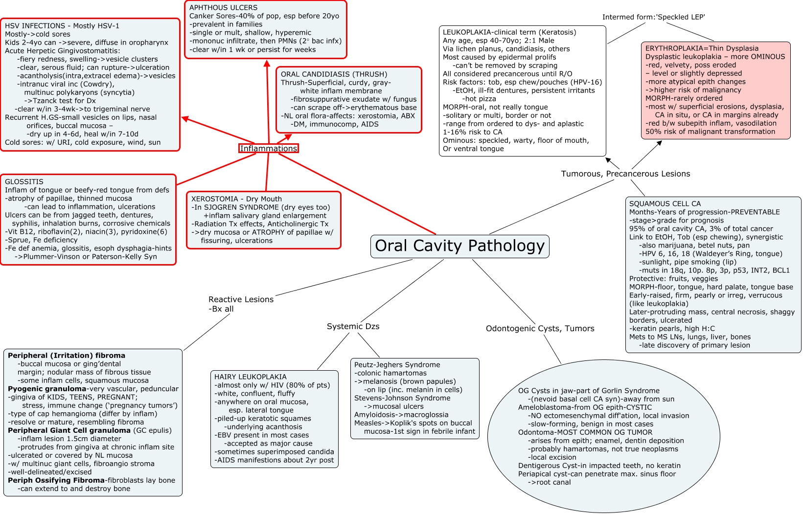 Oral Cavity Pathology, Oral Cavity Pathology Inflammations GLOSSITIS Inflam of tongue or beefy-red tongue from defs -atrophy of papillae, thinned mucosa -can lead to inflammation, ulcerations Ulcers can be from jagged teeth, dentures, syphilis, inhalation burns, corrosive chemicals -Vit B12, riboflavin(2), niacin(3), pyridoxine(6) -Sprue, Fe deficiency -Fe def anemia, glossitis, esoph dysphagia-hints ->Plummer-Vinson or Paterson-Kelly Syn, Oral Cavity Pathology Tumorous, Precancerous Lesions SQUAMOUS CELL CA Months-Years of progression-PREVENTABLE -stage>grade for prognosis 95% of oral cavity CA, 3% of total cancer Link to EtOH, Tob (esp chewing), synergistic -also marijuana, betel nuts, pan -HPV 6, 16, 18 (Waldeyer’s Ring, tongue) -sunlight, pipe smoking (lip) -muts in 18q, 10p. 8p, 3p, p53, INT2, BCL1 Protective: fruits, veggies MORPH-floor, tongue, hard palate, tongue base Early-raised, firm, pearly or irreg, verrucous (like leukoplakia) Later-protruding mass, central necrosis, shaggy borders, ulcerated -keratin pearls, high H:C Mets to MS LNs, lungs, liver, bones -late discovery of primary lesion, Oral Cavity Pathology Tumorous, Precancerous Lesions LEUKOPLAKIA-clinical term (Keratosis) Any age, esp 40-70yo; 2:1 Male Via lichen planus, candidiasis, others Most caused by epidermal prolifs -can’t be removed by scraping All considered precancerous until R/O Risk factors: tob, esp chew/pouches (HPV-16) -EtOH, ill-fit dentures, persistent irritants -hot pizza MORPH-oral, not really tongue -solitary or multi, border or not -range from ordered to dys- and aplastic 1-16% risk to CA Ominous: speckled, warty, floor of mouth, Or ventral tongue, LEUKOPLAKIA-clinical term (Keratosis) Any age, esp 40-70yo; 2:1 Male Via lichen planus, candidiasis, others Most caused by epidermal prolifs -can’t be removed by scraping All considered precancerous until R/O Risk factors: tob, esp chew/pouches (HPV-16) -EtOH, ill-fit dentures, persistent irritants -hot pizza MORPH-oral, not really tongue -solitary or multi, border or not -range from ordered to dys- and aplastic 1-16% risk to CA Ominous: speckled, warty, floor of mouth, Or ventral tongue Intermed form:'Speckled LEP' ERYTHROPLAKIA=Thin Dysplasia Dysplastic leukoplakia – more OMINOUS -red, velvety, poss eroded – level or slightly depressed -more atypical epith changes ->higher risk of malignancy MORPH-rarely ordered -most w/ superficial erosions, dysplasia, CA in situ, or CA in margins already -red b/w subepith inflam, vasodilation 50% risk of malignant transformation, Oral Cavity Pathology Reactive Lesions -Bx all Peripheral (Irritation) fibroma -buccal mucosa or ging’dental margin; nodular mass of fibrous tissue -some inflam cells, squamous mucosa Pyogenic granuloma-very vascular, peduncular -gingiva of KIDS, TEENS, PREGNANT; stress, immune change (‘pregnancy tumors’) -type of cap hemangioma (differ by inflam) -resolve or mature, resembling fibroma Peripheral Giant Cell granuloma (GC epulis) -inflam lesion 1.5cm diameter -protrudes from gingiva at chronic inflam site -ulcerated or covered by NL mucosa -w/ multinuc giant cells, fibroangio stroma -well-delineated/excised Periph Ossifying Fibroma-fibroblasts lay bone -can extend to and destroy bone, Oral Cavity Pathology Systemic Dzs Peutz-Jeghers Syndrome -colonic hamartomas ->melanosis (brown papules) -on lip (inc. melanin in cells) Stevens-Johnson Syndrome ->mucosal ulcers Amyloidosis->macroglossia Measles->Koplik's spots on buccal mucosa-1st sign in febrile infant, Oral Cavity Pathology Systemic Dzs HAIRY LEUKOPLAKIA -almost only w/ HIV (80% of pts) -white, confluent, fluffy -anywhere on oral mucosa, esp. lateral tongue -piled-up keratotic squames -underlying acanthosis -EBV present in most cases -accepted as major cause -sometimes superimposed candida -AIDS manifestions about 2yr post, Oral Cavity Pathology Odontogenic Cysts, Tumors OG Cysts in jaw-part of Gorlin Syndrome -(nevoid basal cell CA syn)-away from sun Ameloblastoma-from OG epith-CYSTIC -NO ectomesenchymal diff'ation, local invasion -slow-forming, benign in most cases Odontoma-MOST COMMON OG TUMOR -arises from epith; enamel, dentin deposition -probably hamartomas, not true neoplasms -local excision Dentigerous Cyst-in impacted teeth, no keratin Periapical cyst-can penetrate max. sinus floor ->root canal, Oral Cavity Pathology Inflammations HSV INFECTIONS - Mostly HSV-1 Mostly->cold sores Kids 2-4yo can ->severe, diffuse in oropharynx Acute Herpetic Gingivostomatitis: -fiery redness, swelling->vesicle clusters -clear, serous fluid; can rupture->ulceration -acantholysis(intra,extracel edema)->vesicles -intranuc viral inc (Cowdry), multinuc polykaryons (syncytia) ->Tzanck test for Dx -clear w/in 3-4wk->to trigeminal nerve Recurrent H.GS-small vesicles on lips, nasal orifices, buccal mucosa – -dry up in 4-6d, heal w/in 7-10d Cold sores: w/ URI, cold exposure, wind, sun, Oral Cavity Pathology Inflammations XEROSTOMIA - Dry Mouth -In SJOGREN SYNDROME (dry eyes too) +inflam salivary gland enlargement -Radiation Tx effects, Anticholinergic Tx ->dry mucosa or ATROPHY of papillae w/ fissuring, ulcerations