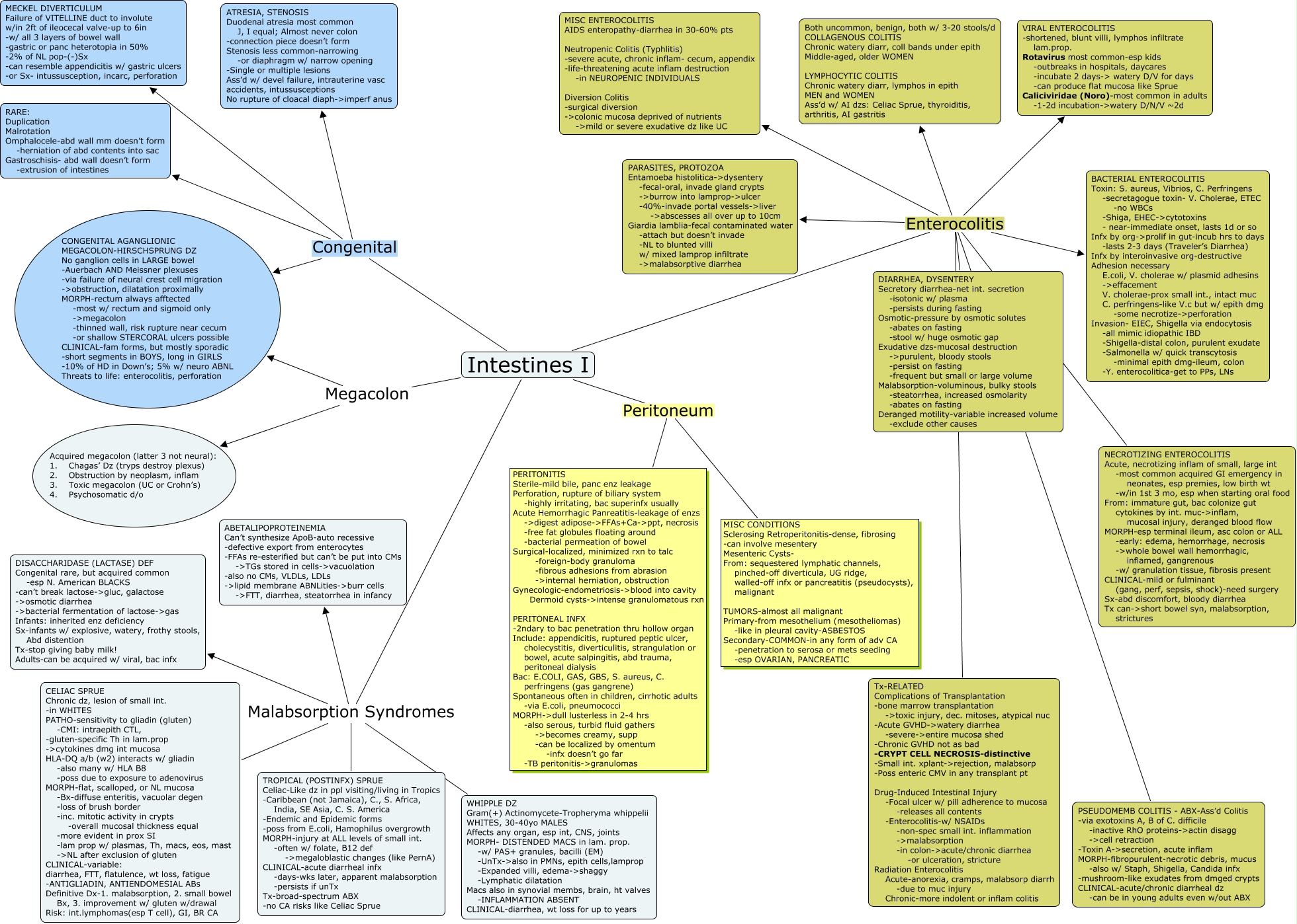 Intestines I, Intestines I Peritoneum MISC CONDITIONS Sclerosing Retroperitonitis-dense, fibrosing -can involve mesentery Mesenteric Cysts- From: sequestered lymphatic channels, pinched-off diverticula, UG ridge, walled-off infx or pancreatitis (pseudocysts), malignant TUMORS-almost all malignant Primary-from mesothelium (mesotheliomas) -like in pleural cavity-ASBESTOS Secondary-COMMON-in any form of adv CA -penetration to serosa or mets seeding -esp OVARIAN, PANCREATIC, Intestines I Malabsorption Syndromes DISACCHARIDASE (LACTASE) DEF Congenital rare, but acquired common -esp N. American BLACKS -can’t break lactose->gluc, galactose ->osmotic diarrhea ->bacterial fermentation of lactose->gas Infants: inherited enz deficiency Sx-infants w/ explosive, watery, frothy stools, Abd distention Tx-stop giving baby milk! Adults-can be acquired w/ viral, bac infx, Intestines I Malabsorption Syndromes TROPICAL (POSTINFX) SPRUE Celiac-Like dz in ppl visiting/living in Tropics -Caribbean (not Jamaica), C., S. Africa, India, SE Asia, C. S. America -Endemic and Epidemic forms -poss from E.coli, Hamophilus overgrowth MORPH-injury at ALL levels of small int. -often w/ folate, B12 def ->megaloblastic changes (like PernA) CLINICAL-acute diarrheal infx -days-wks later, apparent malabsorption -persists if unTx Tx-broad-spectrum ABX -no CA risks like Celiac Sprue, Intestines I Megacolon CONGENITAL AGANGLIONIC MEGACOLON-HIRSCHSPRUNG DZ No ganglion cells in LARGE bowel -Auerbach AND Meissner plexuses -via failure of neural crest cell migration ->obstruction, dilatation proximally MORPH-rectum always afftected -most w/ rectum and sigmoid only ->megacolon -thinned wall, risk rupture near cecum -or shallow STERCORAL ulcers possible CLINICAL-fam forms, but mostly sporadic -short segments in BOYS, long in GIRLS -10% of HD in Down’s; 5% w/ neuro ABNL Threats to life: enterocolitis, perforation, Intestines I Megacolon Acquired megacolon (latter 3 not neural): 1. Chagas’ Dz (tryps destroy plexus) 2. Obstruction by neoplasm, inflam 3. Toxic megacolon (UC or Crohn’s) 4. Psychosomatic d/o, Intestines I Enterocolitis VIRAL ENTEROCOLITIS -shortened, blunt villi, lymphos infiltrate lam.prop. Rotavirus most common-esp kids -outbreaks in hospitals, daycares -incubate 2 days-> watery D/V for days -can produce flat mucosa like Sprue Caliciviridae (Noro)-most common in adults -1-2d incubation->watery D/N/V ~2d, Intestines I Malabsorption Syndromes CELIAC SPRUE Chronic dz, lesion of small int. -in WHITES PATHO-sensitivity to gliadin (gluten) -CMI: intraepith CTL, -gluten-specific Th in lam.prop ->cytokines dmg int mucosa HLA-DQ a/b (w2) interacts w/ gliadin -also many w/ HLA B8 -poss due to exposure to adenovirus MORPH-flat, scalloped, or NL mucosa -Bx-diffuse enteritis, vacuolar degen -loss of brush border -inc. mitotic activity in crypts -overall mucosal thickness equal -more evident in prox SI -lam prop w/ plasmas, Th, macs, eos, mast ->NL after exclusion of gluten CLINICAL-variable: diarrhea, FTT, flatulence, wt loss, fatigue -ANTIGLIADIN, ANTIENDOMESIAL ABs Definitive Dx-1. malabsorption, 2. small bowel Bx, 3. improvement w/ gluten w/drawal Risk: int.lymphomas(esp T cell), GI, BR CA, Intestines I Congenital RARE: Duplication Malrotation Omphalocele-abd wall mm doesn’t form -herniation of abd contents into sac Gastroschisis- abd wall doesn’t form -extrusion of intestines, Intestines I Enterocolitis Both uncommon, benign, both w/ 3-20 stools/d COLLAGENOUS COLITIS Chronic watery diarr, coll bands under epith Middle-aged, older WOMEN LYMPHOCYTIC COLITIS Chronic watery diarr, lymphos in epith MEN and WOMEN Ass’d w/ AI dzs: Celiac Sprue, thyroiditis, arthritis, AI gastritis, Intestines I Malabsorption Syndromes ABETALIPOPROTEINEMIA Can’t synthesize ApoB-auto recessive -defective export from enterocytes -FFAs re-esterified but can’t be put into CMs ->TGs stored in cells->vacuolation -also no CMs, VLDLs, LDLs ->lipid membrane ABNLities->burr cells ->FTT, diarrhea, steatorrhea in infancy