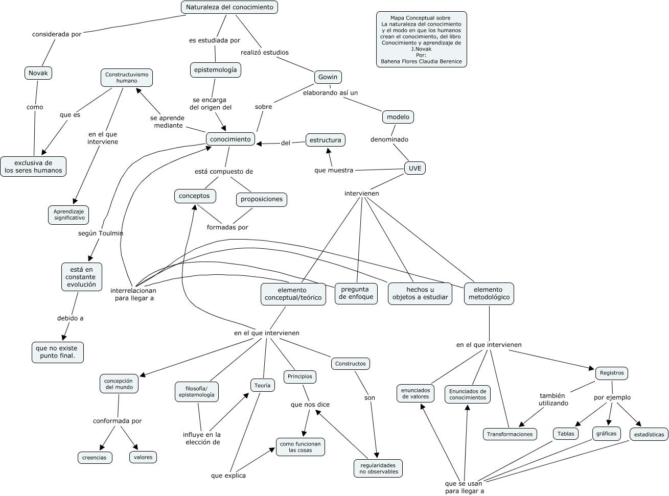 Este mapa conceptual tiene información relacionada a: La naturaleza del conocimiento y el modo en que los humanos crean el conocimiento, elemento conceptual/teórico en el que intervienen Teoría, elemento metodológico en el que intervienen enunciados de valores, modelo denominado UVE, Naturaleza del conocimiento considerada por Novak, conocimiento está compuesto de conceptos, Constructuvismo humano en el que interviene Aprendizaje significativo, UVE que muestra estructura, elemento conceptual/teórico en el que intervienen conceptos, Tablas que se usan para llegar a enunciados de valores, elemento metodológico en el que intervienen Registros