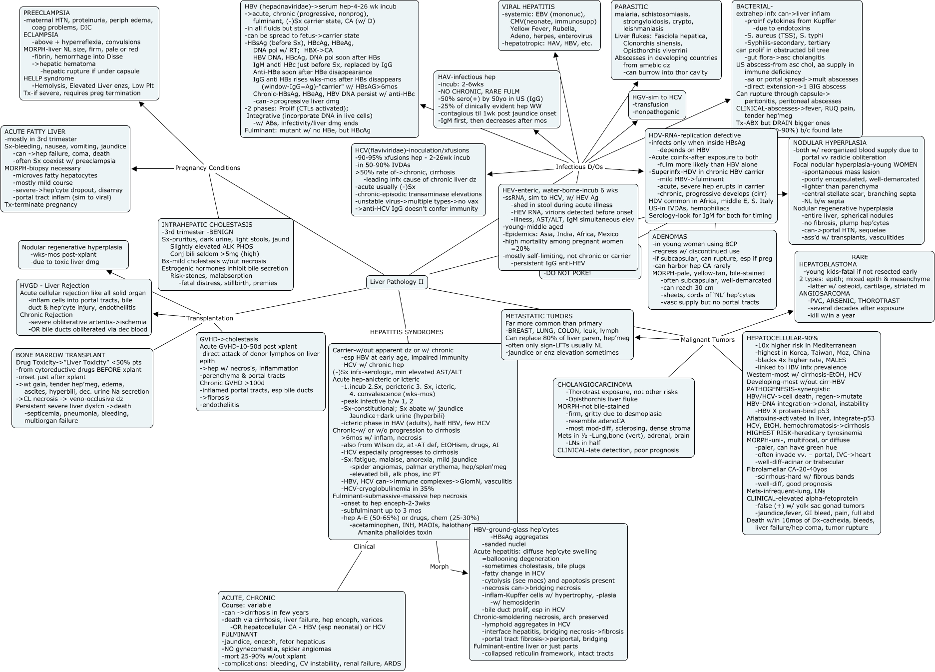 This Concept Map, created with IHMC CmapTools, has information related to: Liver Pathology II, Liver Pathology II Infectious D/Os BACTERIAL- extrahep infx can->liver inflam -proinf cytokines from Kupffer -due to endotoxins -S. aureus (TSS), S. typhi -Syphilis-secondary, tertiary can prolif in obstructed bil tree -gut flora->asc cholangitis US abscess-from asc chol, aa supply in immune deficiency -aa or portal spread->mult abscesses -direct extension-ɭ BIG abscess Can rupture through capsule-> peritonitis, peritoneal abscesses CLINICAL-abscesses->fever, RUQ pain, tender hep'meg Tx-ABX but DRAIN bigger ones High mort (30-90%) b/c found late, Liver Pathology II Infectious D/Os HAV-infectious hep -incub: 2-6wks -NO CHRONIC, RARE FULM -50% sero(+) by 50yo in US (IgG) -25% of clinically evident hep WW -contagious til 1wk post jaundice onset -IgM first, then decreases after mos, Liver Pathology II Malignant Tumors RARE HEPATOBLASTOMA -young kids-fatal if not resected early 2 types: epith; mixed epith & mesenchyme -latter w/ osteoid, cartilage, striated m ANGIOSARCOMA -PVC, ARSENIC, THOROTRAST -several decades after exposure -kill w/in a year, Liver Pathology II Infectious D/Os PARASITIC malaria, schistosomiasis, strongyloidosis, crypto, leishmaniasis Liver flukes: Fasciola hepatica, Clonorchis sinensis, Opisthorchis viverrini Abscesses in developing countries from amebic dz -can burrow into thor cavity, Carrier-w/out apparent dz or w/ chronic -esp HBV at early age, impaired immunity -HCV-w/ chronic hep (-)Sx infx-serologic, min elevated AST/ALT Acute hep-anicteric or icteric -1.incub 2.Sx, pericteric 3. Sx, icteric, 4. convalescence (wks-mos) -peak infective b/w 1, 2 -Sx-constitutional; Sx abate w/ jaundice Jaundice+dark urine (hyperbili) -icteric phase in HAV (adults), half HBV, few HCV Chronic-w/ or w/o progression to cirrhosis ɲmos w/ inflam, necrosis -also from Wilson dz, a1-AT def, EtOHism, drugs, AI -HCV especially progresses to cirrhosis -Sx:fatigue, malaise, anorexia, mild jaundice -spider angiomas, palmar erythema, hep/splen'meg -elevated bili, alk phos, inc PT -HBV, HCV can->immune complexes->GlomN, vasculitis -HCV-cryoglobulinemia in 35% Fulminant-submassive-massive hep necrosis -onset to hep enceph-2-3wks -subfulminant up to 3 mos -hep A-E (50-65%) or drugs, chem (25-30%) -acetaminophen, INH, MAOIs, halothane, methyldopa, Amanita phalloides toxin Clinical ACUTE, CHRONIC Course: variable -can ->cirrhosis in few years -death via cirrhosis, liver failure, hep enceph, varices -OR hepatocellular CA - HBV (esp neonatal) or HCV FULMINANT -jaundice, enceph, fetor hepaticus -NO gynecomastia, spider angiomas -mort 25-90% w/out xplant -complications: bleeding, CV instability, renal failure, ARDS, Carrier-w/out apparent dz or w/ chronic -esp HBV at early age, impaired immunity -HCV-w/ chronic hep (-)Sx infx-serologic, min elevated AST/ALT Acute hep-anicteric or icteric -1.incub 2.Sx, pericteric 3. Sx, icteric, 4. convalescence (wks-mos) -peak infective b/w 1, 2 -Sx-constitutional; Sx abate w/ jaundice Jaundice+dark urine (hyperbili) -icteric phase in HAV (adults), half HBV, few HCV Chronic-w/ or w/o progression to cirrhosis ɲmos w/ inflam, necrosis -also from Wilson dz, a1-AT def, EtOHism, drugs, AI -HCV especially progresses to cirrhosis -Sx:fatigue, malaise, anorexia, mild jaundice -spider angiomas, palmar erythema, hep/splen'meg -elevated bili, alk phos, inc PT -HBV, HCV can->immune complexes->GlomN, vasculitis -HCV-cryoglobulinemia in 35% Fulminant-submassive-massive hep necrosis -onset to hep enceph-2-3wks -subfulminant up to 3 mos -hep A-E (50-65%) or drugs, chem (25-30%) -acetaminophen, INH, MAOIs, halothane, methyldopa, Amanita phalloides toxin Morph HBV-ground-glass hep'cytes -HBsAg aggregates -sanded nuclei Acute hepatitis: diffuse hep'cyte swelling =ballooning degeneration -sometimes cholestasis, bile plugs -fatty change in HCV -cytolysis (see macs) and apoptosis present -necrosis can->bridging necrosis -inflam-Kupffer cells w/ hypertrophy, -plasia -w/ hemosiderin -bile duct prolif, esp in HCV Chronic-smoldering necrosis, arch preserved -lymphoid aggregates in HCV -interface hepatitis, bridging necrosis->fibrosis -portal tract fibrosis->periportal, bridging Fulminant-entire liver or just parts -collapsed reticulin framework, intact tracts, Liver Pathology II Benign Tumors ADENOMAS -in young women using BCP -regress w/ discontinued use -if subcapsular, can rupture, esp if preg -can harbor hep CA rarely MORPH-pale, yellow-tan, bile-stained -often subcapsular, well-demarcated -can reach 30 cm -sheets, cords of ‘NL’ hep’cytes -vasc supply but no portal tracts, Liver Pathology II Malignant Tumors HEPATOCELLULAR-90% -10x higher risk in Mediterranean -highest in Korea, Taiwan, Moz, China -blacks 4x higher rate, MALES -linked to HBV infx prevalence Western-most w/ cirrhosis-EtOH, HCV Developing-most w/out cirr-HBV PATHOGENESIS-synergistic HBV/HCV->cell death, regen->mutate HBV-DNA integration->clonal, instability -HBV X protein-bind p53 Aflatoxins-activated in liver, integrate-p53 HCV, EtOH, hemochromatosis->cirrhosis HIGHEST RISK-hereditary tyrosinemia MORPH-uni-, multifocal, or diffuse -paler, can have green hue -often invade vv. – portal, IVC->heart -well-diff-acinar or trabecular Fibrolamellar CA-20-40yos -scirrhous-hard w/ fibrous bands -well-diff, good prognosis Mets-infrequent-lung, LNs CLINICAL-elevated alpha-fetoprotein -false (+) w/ yolk sac gonad tumors -jaundice,fever, GI bleed, pain, full abd Death w/in 10mos of Dx-cachexia, bleeds, liver failure/hep coma, tumor rupture, Liver Pathology II Malignant Tumors METASTATIC TUMORS Far more common than primary -BREAST, LUNG, COLON, leuk, lymph Can replace 80% of liver paren, hep’meg -often only sign-LFTs usually NL -jaundice or enz elevation sometimes, Liver Pathology II Transplantation GVHD->cholestasis Acute GVHD-10-50d post xplant -direct attack of donor lymphos on liver epith ->hep w/ necrosis, inflammation -parenchyma 