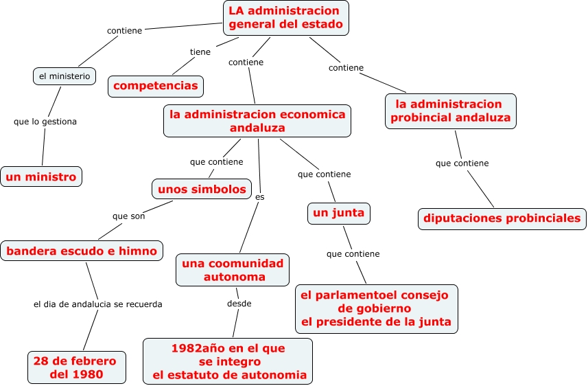 Este mapa conceptual tiene información relacionada a: diego virues suazo (la organizacion politica), unos simbolos que son bandera escudo e himno, el ministerio que lo gestiona un ministro, la administracion economica andaluza que contiene un junta, un junta que contiene el parlamentoel consejo de gobierno el presidente de la junta, la administracion probincial andaluza que contiene diputaciones probinciales, una coomunidad autonoma desde 1982año en el que se integro el estatuto de autonomia, LA administracion general del estado contiene la administracion economica andaluza, LA administracion general del estado contiene el ministerio, la administracion economica andaluza es una coomunidad autonoma, bandera escudo e himno el dia de andalucia se recuerda 28 de febrero del 1980