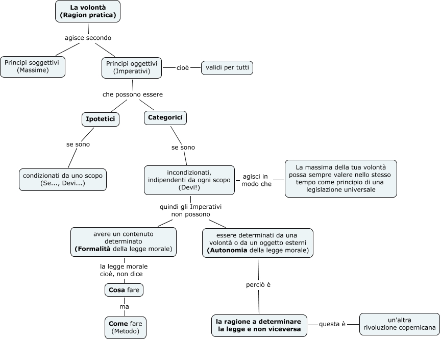 Kantpratica3, Principi oggettivi (Imperativi) cioè validi per tutti, Principi oggettivi (Imperativi) che possono essere Ipotetici, incondizionati, indipendenti da ogni scopo (Devi!) quindi gli Imperativi non possono essere determinati da una volontà o da un oggetto esterni (Autonomia della legge morale), incondizionati, indipendenti da ogni scopo (Devi!) quindi gli Imperativi non possono avere un contenuto determinato (Formalità della legge morale), La volontà (Ragion pratica) agisce secondo Principi soggettivi (Massime), La volontà (Ragion pratica) agisce secondo Principi oggettivi (Imperativi), la ragione a determinare la legge e non viceversa questa è un'altra rivoluzione copernicana, incondizionati, indipendenti da ogni scopo (Devi!) agisci in modo che La massima della tua volontà possa sempre valere nello stesso tempo come principio di una legislazione universale, Ipotetici se sono condizionati da uno scopo (Se..., Devi...), essere determinati da una volontà o da un oggetto esterni (Autonomia della legge morale) perciò è la ragione a determinare la legge e non viceversa