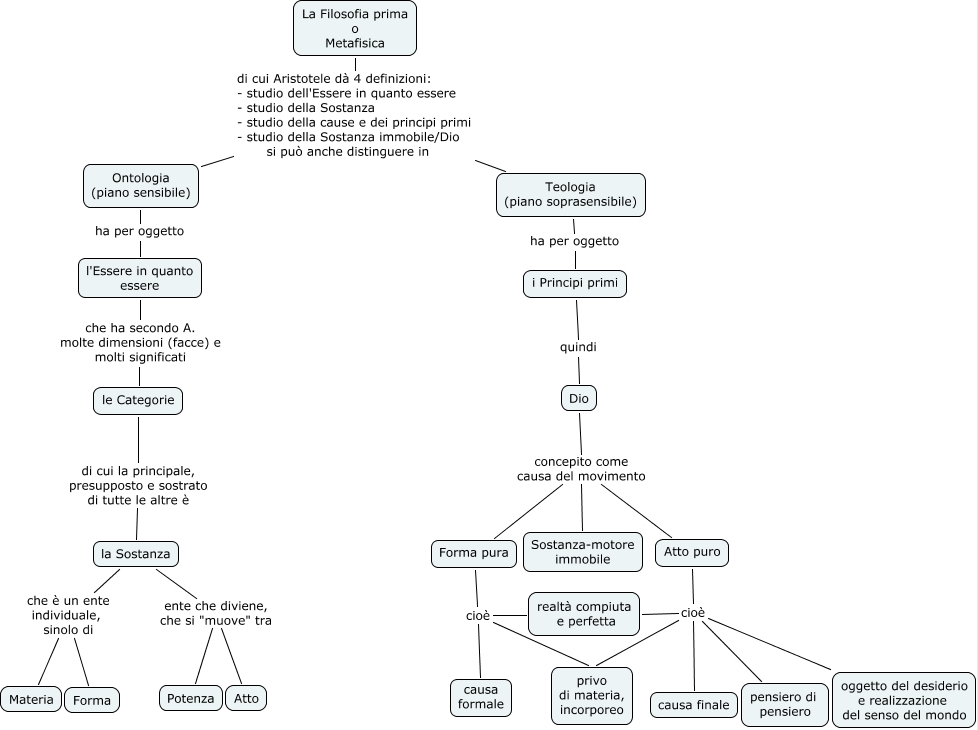 metafisicaristotelica, Dio concepito come causa del movimento Sostanza-motore immobile, Forma pura cioè causa formale, La Filosofia prima o Metafisica di cui Aristotele dà 4 definizioni: - studio dell'Essere in quanto essere - studio della Sostanza - studio della cause e dei principi primi - studio della Sostanza immobile/Dio si può anche distinguere in Teologia (piano soprasensibile), Forma pura cioè realtà compiuta e perfetta, le Categorie di cui la principale, presupposto e sostrato di tutte le altre è la Sostanza, Atto puro cioè realtà compiuta e perfetta, la Sostanza che è un ente individuale, sinolo di Forma, Ontologia (piano sensibile) ha per oggetto l'Essere in quanto essere, Atto puro cioè causa finale, la Sostanza ente che diviene, che si "muove" tra Atto