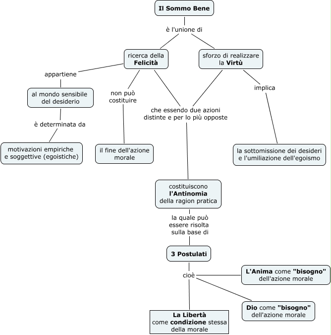 Kantpratica4, sforzo di realizzare la Virtù che essendo due azioni distinte e per lo più opposte costituiscono l'Antinomia della ragion pratica, Il Sommo Bene è l'unione di sforzo di realizzare la Virtù, ricerca della Felicità non può costituire il fine dell'azione morale, ricerca della Felicità appartiene al mondo sensibile del desiderio, Il Sommo Bene è l'unione di ricerca della Felicità, 3 Postulati cioè La Libertà come condizione stessa della morale, costituiscono l'Antinomia della ragion pratica la quale può essere risolta sulla base di 3 Postulati, 3 Postulati cioè Dio come "bisogno" dell'azione morale, sforzo di realizzare la Virtù implica la sottomissione dei desideri e l'umiliazione dell'egoismo, ricerca della Felicità che essendo due azioni distinte e per lo più opposte costituiscono l'Antinomia della ragion pratica
