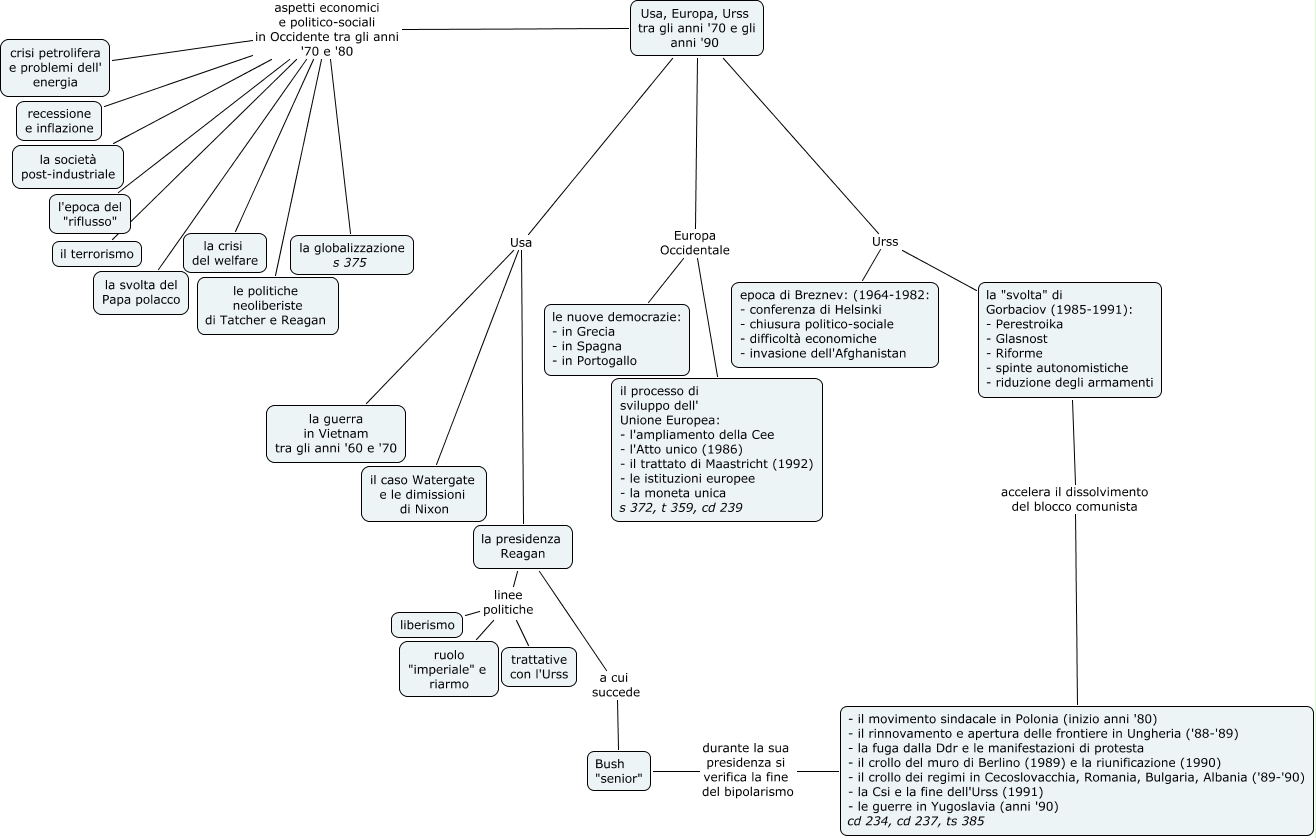 m6, Usa, Europa, Urss tra gli anni '70 e gli anni '90 aspetti economici e politico-sociali in Occidente tra gli anni '70 e '80 la svolta del Papa polacco, Usa, Europa, Urss tra gli anni '70 e gli anni '90 aspetti economici e politico-sociali in Occidente tra gli anni '70 e '80 l'epoca del "riflusso", Usa, Europa, Urss tra gli anni '70 e gli anni '90 aspetti economici e politico-sociali in Occidente tra gli anni '70 e '80 la crisi del welfare, Usa, Europa, Urss tra gli anni '70 e gli anni '90 Usa il caso Watergate e le dimissioni di Nixon, Usa, Europa, Urss tra gli anni '70 e gli anni '90 Urss la "svolta" di Gorbaciov (1985-1991): - Perestroika - Glasnost - Riforme - spinte autonomistiche - riduzione degli armamenti, Usa, Europa, Urss tra gli anni '70 e gli anni '90 aspetti economici e politico-sociali in Occidente tra gli anni '70 e '80 crisi petrolifera e problemi dell' energia, la presidenza Reagan linee politiche trattative con l'Urss, Usa, Europa, Urss tra gli anni '70 e gli anni '90 aspetti economici e politico-sociali in Occidente tra gli anni '70 e '80 il terrorismo, la presidenza Reagan a cui succede Bush "senior", Bush "senior" durante la sua presidenza si verifica la fine del bipolarismo - il movimento sindacale in Polonia (inizio anni '80) - il rinnovamento e apertura delle frontiere in Ungheria ('88-'89) - la fuga dalla Ddr e le manifestazioni di protesta - il crollo del muro di Berlino (1989) e la riunificazione (1990) - il crollo dei regimi in Cecoslovacchia, Romania, Bulgaria, Albania ('89-'90) - la Csi e la fine dell'Urss (1991) - le guerre in Yugoslavia (anni '90) cd 234, cd 237, ts 385