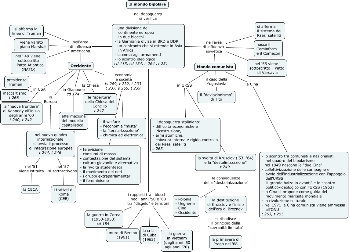 m5, Occidente in USA presidenza Truman, Mondo comunista in URSS - il dopoguerra staliniano: - difficoltà economiche e ricostruzione, - armi atomiche, - chiusura interna e rigido controllo dei Paesi satelliti s 263, - una divisione del continente europeo in due blocchi - la Germania divisa in BRD e DDR - un confronto che si estende in Asia in Africa - la corsa agli armamenti - lo scontro ideologico cd 115, cd 154, s 264, t 231 i rapporti tra i blocchi negli anni '50 e '60 tra "disgelo" e tensioni la crisi di Cuba (1962), - una divisione del continente europeo in due blocchi - la Germania divisa in BRD e DDR - un confronto che si estende in Asia in Africa - la corsa agli armamenti - lo scontro ideologico cd 115, cd 154, s 264, t 231 i rapporti tra i blocchi negli anni '50 e '60 tra "disgelo" e tensioni la guerra in Corea (1950-1953) cd 184, - una divisione del continente europeo in due blocchi - la Germania divisa in BRD e DDR - un confronto che si estende in Asia in Africa - la corsa agli armamenti - lo scontro ideologico cd 115, cd 154, s 264, t 231 nell'area di influenza americana viene varato il piano Marshall, - una divisione del continente europeo in due blocchi - la Germania divisa in BRD e DDR - un confronto che si estende in Asia in Africa - la corsa agli armamenti - lo scontro ideologico cd 115, cd 154, s 264, t 231 nell'area di influenza americana si afferma la linea di Truman, Occidente in USA maccartismo t 266, - una divisione del continente europeo in due blocchi - la Germania divisa in BRD e DDR - un confronto che si estende in Asia in Africa - la corsa agli armamenti - lo scontro ideologico cd 115, cd 154, s 264, t 231 nell'area di influenza americana Occidente, - una divisione del continente europeo in due blocchi - la Germania divisa in BRD e DDR - un confronto che si estende in Asia in Africa - la corsa agli armamenti - lo scontro ideologico cd 115, cd 154, s 264, t 231 nell'area di influenza sovietica nel '55 viene sottoscritto il Patto di Varsavia, Occidente la Chiesa le "aperture" della Chiesa del Concilio t 247