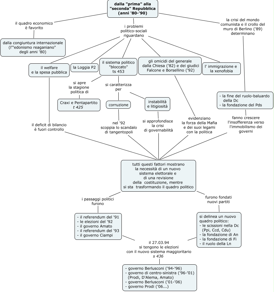 anni '80-'90, dalla "prima" alla "seconda" Repubblica (anni '80-'90) il quadro economico è favorito dalla congiuntura internazionale (l'"edonismo reaganiano" degli anni '80), tutti questi fattori mostrano la necessità di un nuovo sistema elettorale e di una revisione della costituzione, mentre si sta trasformando il quadro politico i passaggi politici furono - il referendum del '91 - le elezioni del '92 - il governo Amato - il referendum del '93 - il governo Ciampi, il sistema politico "bloccato" ts 453 si apre la stagione politica di Craxi e Pentapartito t 425, dalla "prima" alla "seconda" Repubblica (anni '80-'90) i problemi politico-sociali riguardano la Loggia P2, tutti questi fattori mostrano la necessità di un nuovo sistema elettorale e di una revisione della costituzione, mentre si sta trasformando il quadro politico furono fondati nuovi partiti si delinea un nuovo quadro politico: - le scissioni nella Dc (Ppi, Ccd, Cdu) - la fondazione di An - la fondazione di Fi - il ruolo della Ln, dalla "prima" alla "seconda" Repubblica (anni '80-'90) i problemi politico-sociali riguardano gli omicidi del generale dalla Chiesa ('82) e dei giudici Falcone e Borsellino ('92), dalla "prima" alla "seconda" Repubblica (anni '80-'90) i problemi politico-sociali riguardano il welfare e la spesa pubblica, dalla "prima" alla "seconda" Repubblica (anni '80-'90) i problemi politico-sociali riguardano il sistema politico "bloccato" ts 453, dalla "prima" alla "seconda" Repubblica (anni '80-'90) la crisi del mondo comunista e il crollo del muro di Berlino ('89) determinano - la fine del ruolo-baluardo della Dc - la fondazione del Pds, il sistema politico "bloccato" ts 453 si caratterizza per instabilità e litigiosità