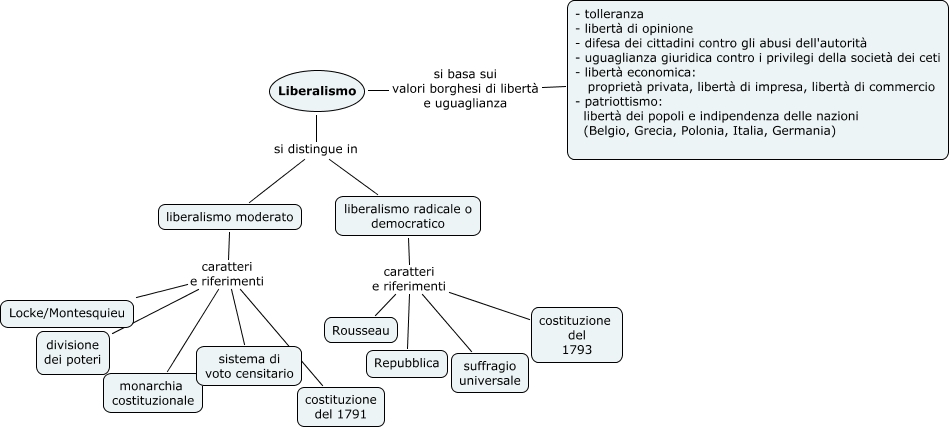 liberalismo, Liberalismo si distingue in liberalismo radicale o democratico, liberalismo moderato caratteri e riferimenti costituzione del 1791, liberalismo radicale o democratico caratteri e riferimenti Rousseau, liberalismo moderato caratteri e riferimenti monarchia costituzionale, Liberalismo si distingue in liberalismo moderato, liberalismo moderato caratteri e riferimenti sistema di voto censitario, liberalismo moderato caratteri e riferimenti divisione dei poteri, liberalismo moderato caratteri e riferimenti Locke/Montesquieu, liberalismo radicale o democratico caratteri e riferimenti Repubblica, liberalismo radicale o democratico caratteri e riferimenti suffragio universale