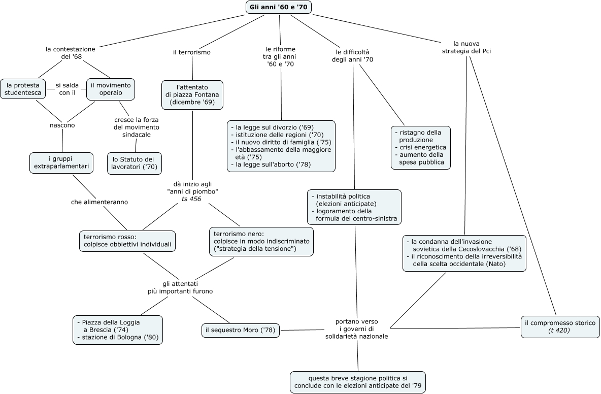 anni '60-'70, terrorismo nero: colpisce in modo indiscriminato ("strategia della tensione") gli attentati più importanti furono - Piazza della Loggia a Brescia ('74) - stazione di Bologna ('80), Gli anni '60 e '70 il terrorismo l'attentato di piazza Fontana (dicembre '69), la protesta studentesca si salda con il il movimento operaio, Gli anni '60 e '70 le riforme tra gli anni '60 e '70 - la legge sul divorzio ('69) - istituzione delle regioni ('70) - il nuovo diritto di famiglia ('75) - l'abbassamento della maggiore età ('75) - la legge sull'aborto ('78), il movimento operaio cresce la forza del movimento sindacale lo Statuto dei lavoratori ('70), il movimento operaio nascono i gruppi extraparlamentari, Gli anni '60 e '70 le difficoltà degli anni '70 - instabilità politica (elezioni anticipate) - logoramento della formula del centro-sinistra, Gli anni '60 e '70 la nuova strategia del Pci - la condanna dell'invasione sovietica della Cecoslovacchia ('68) - il riconoscimento della irreversibilità della scelta occidentale (Nato), la protesta studentesca nascono i gruppi extraparlamentari, Gli anni '60 e '70 la contestazione del '68 la protesta studentesca