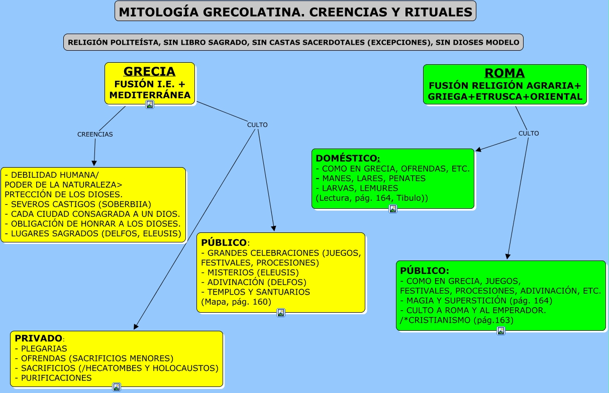 Este Cmap, tiene información relacionada con: Mitología. Creencias y Riituales, GRECIA FUSIÓN I.E. + MEDITERRÁNEA CULTO PRIVADO: - PLEGARIAS - OFRENDAS (SACRIFICIOS MENORES) - SACRIFICIOS (/HECATOMBES Y HOLOCAUSTOS) - PURIFICACIONES, ROMA FUSIÓN RELIGIÓN AGRARIA+ GRIEGA+ETRUSCA+ORIENTAL CULTO PÚBLICO: - COMO EN GRECIA, JUEGOS, FESTIVALES, PROCESIONES, ADIVINACIÓN, ETC. - MAGIA Y SUPERSTICIÓN (pág. 164) - CULTO A ROMA Y AL EMPERADOR. /*CRISTIANISMO (pág.163), GRECIA FUSIÓN I.E. + MEDITERRÁNEA CULTO PÚBLICO: - GRANDES CELEBRACIONES (JUEGOS, FESTIVALES, PROCESIONES) - MISTERIOS (ELEUSIS) - ADIVINACIÓN (DELFOS) - TEMPLOS Y SANTUARIOS (Mapa, pág. 160), ROMA FUSIÓN RELIGIÓN AGRARIA+ GRIEGA+ETRUSCA+ORIENTAL CULTO DOMÉSTICO: - COMO EN GRECIA, OFRENDAS, ETC. - MANES, LARES, PENATES - LARVAS, LEMURES (Lectura, pág. 164, Tibulo)), GRECIA FUSIÓN I.E. + MEDITERRÁNEA CREENCIAS - DEBILIDAD HUMANA/ PODER DE LA NATURALEZA> PRTECCIÓN DE LOS DIOSES. - SEVEROS CASTIGOS (SOBERBIIA) - CADA CIUDAD CONSAGRADA A UN DIOS. - OBLIGACIÓN DE HONRAR A LOS DIOSES. - LUGARES SAGRADOS (DELFOS, ELEUSIS)