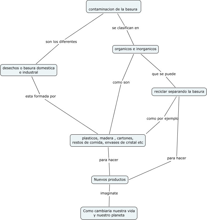 Este mapa conceptual tiene información relacionada a: contaminacion, plasticos, madera , cartones, restos de comida, envases de cristal etc para hacer Nuevos productos, organicos e inorganicos como son plasticos, madera , cartones, restos de comida, envases de cristal etc, desechos o basura domestica e industral esta formada por plasticos, madera , cartones, restos de comida, envases de cristal etc, reciclar separando la basura para hacer Nuevos productos, organicos e inorganicos que se puede reciclar separando la basura, contaminacion de la basura se clasifican en organicos e inorganicos, Nuevos productos imaginate Como cambiaria nuestra vida y nuestro planeta, reciclar separando la basura como por ejemplo plasticos, madera , cartones, restos de comida, envases de cristal etc, contaminacion de la basura son los diferentes desechos o basura domestica e industral