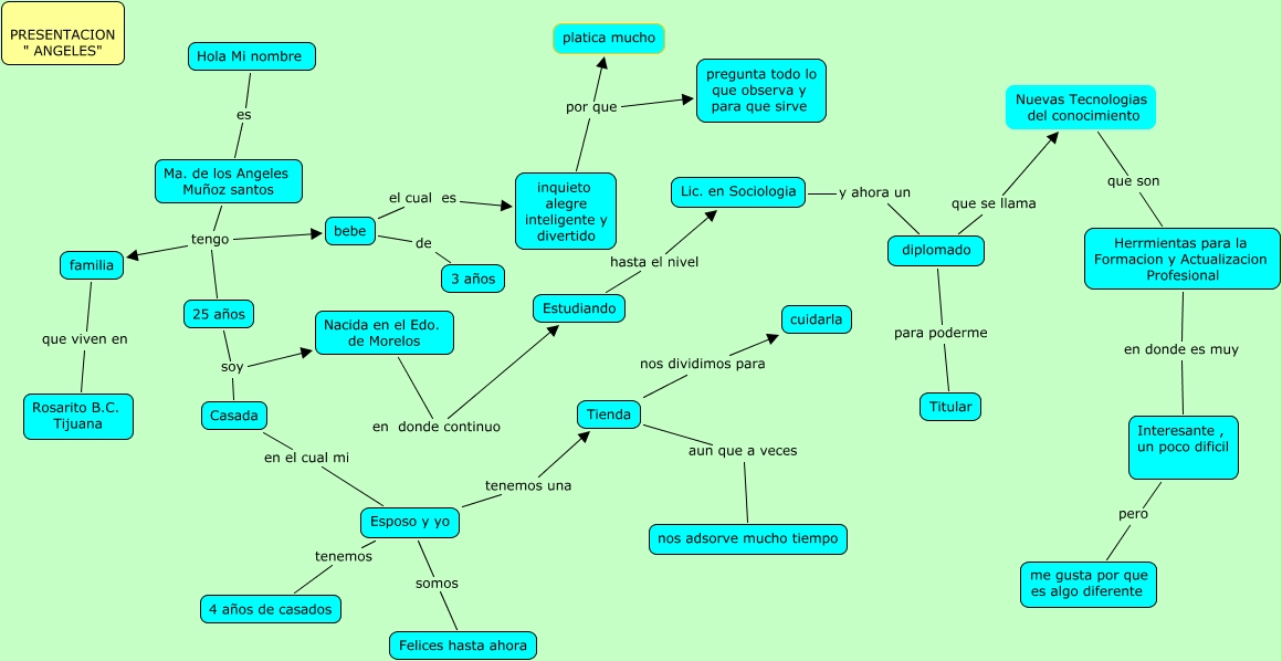 Este mapa conceptual tiene información relacionada a: Presentacion Angeles, Ma. de los Angeles Muñoz santos tengo familia, Lic. en Sociologia y ahora un diplomado, 25 años soy Casada, Esposo y yo somos Felices hasta ahora, Tienda aun que a veces nos adsorve mucho tiempo, Casada en el cual mi Esposo y yo, 25 años soy Nacida en el Edo. de Morelos, Interesante , un poco dificil pero me gusta por que es algo diferente, Ma. de los Angeles Muñoz santos tengo 25 años, inquieto alegre inteligente y divertido por que pregunta todo lo que observa y para que sirve