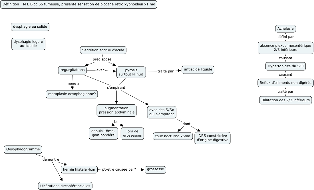 This Concept Map, created with IHMC CmapTools, has information related to: app1 naif, regurgitations avec pyrosis surtout la nuit, pyrosis surtout la nuit s'empirant augmentation pression abdominale, Sécrétion accrue d'acide prédispose regurgitations, regurgitations s'empirant avec des S/Sx qui s'empirent, hernie hiatale 4cm pt-etre causee par? grossesse, augmentation pression abdominale i.e. lors de grossesses, augmentation pression abdominale i.e. depuis 18mo, gain pondéral, Achalasie défini par absence plexus mésentérique 2/3 inférieurs, regurgitations mene a metaplasie oesophagienne?, absence plexus mésentérique 2/3 inférieurs causant Hypertonicité du SOI, pyrosis surtout la nuit s'empirant avec des S/Sx qui s'empirent, regurgitations s'empirant augmentation pression abdominale, Hypertonicité du SOI causant Reflux d"aliments non digérés, pyrosis surtout la nuit traité par antiacide liquide, avec des S/Sx qui s'empirent dont toux nocturne x6mo, Oesophagogramme demontre hernie hiatale 4cm, avec des S/Sx qui s'empirent dont DRS constrictive d'origine digestive, Sécrétion accrue d'acide prédispose pyrosis surtout la nuit, Oesophagogramme demontre Ulcérations circonférencielles, Reflux d"aliments non digérés traité par Dilatation des 2/3 inférieurs