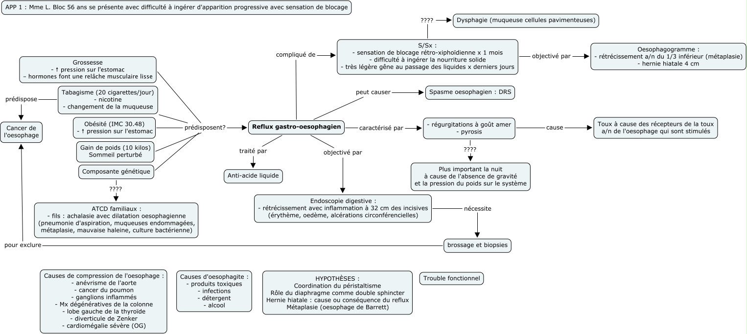 This Concept Map, created with IHMC CmapTools, has information related to: APP1, Reflux gastro-oesophagien objectivé par Endoscopie digestive : - rétrécissement avec inflammation à 32 cm des incisives (érythème, oedème, alcérations circonférencielles), Grossesse - ↑ pression sur l'estomac - hormones font une relâche musculaire lisse prédisposent? Reflux gastro-oesophagien, Composante génétique prédisposent? Reflux gastro-oesophagien, Endoscopie digestive : - rétrécissement avec inflammation à 32 cm des incisives (érythème, oedème, alcérations circonférencielles) nécessite brossage et biopsies, - régurgitations à goût amer - pyrosis ???? Plus important la nuit à cause de l'absence de gravité et la pression du poids sur le système, Gain de poids (10 kilos) Sommeil perturbé prédisposent? Reflux gastro-oesophagien, brossage et biopsies pour exclure Cancer de l'oesophage, Obésité (IMC 30.48) - ↑ pression sur l'estomac prédisposent? Reflux gastro-oesophagien, - régurgitations à goût amer - pyrosis cause Toux à cause des récepteurs de la toux a/n de l'oesophage qui sont stimulés, Composante génétique ???? ATCD familiaux : - fils : achalasie avec dilatation oesophagienne (pneumonie d'aspiration, muqueuses endommagées, métaplasie, mauvaise haleine, culture bactérienne), Reflux gastro-oesophagien traité par Anti-acide liquide, S/Sx : - sensation de blocage rétro-xiphoïdienne x 1 mois - difficulté à ingérer la nourriture solide - très légère gêne au passage des liquides x derniers jours objectivé par Oesophagogramme : - rétrécissement a/n du 1/3 inférieur (métaplasie) - hernie hiatale 4 cm, Reflux gastro-oesophagien caractérisé par - régurgitations à goût amer - pyrosis, Tabagisme (20 cigarettes/jour) - nicotine - changement de la muqueuse prédispose Cancer de l'oesophage, Reflux gastro-oesophagien compliqué de S/Sx : - sensation de blocage rétro-xiphoïdienne x 1 mois - difficulté à ingérer la nourriture solide - très légère gêne au passage des liquides x derniers jours, S/Sx : - sensation de blocage rétro-xiphoïdienne x 1 mois - difficulté à ingérer la nourriture solide - très légère gêne au passage des liquides x derniers jours ???? Dysphagie (muqueuse cellules pavimenteuses), Reflux gastro-oesophagien peut causer Spasme oesophagien : DRS, Tabagisme (20 cigarettes/jour) - nicotine - changement de la muqueuse prédisposent? Reflux gastro-oesophagien