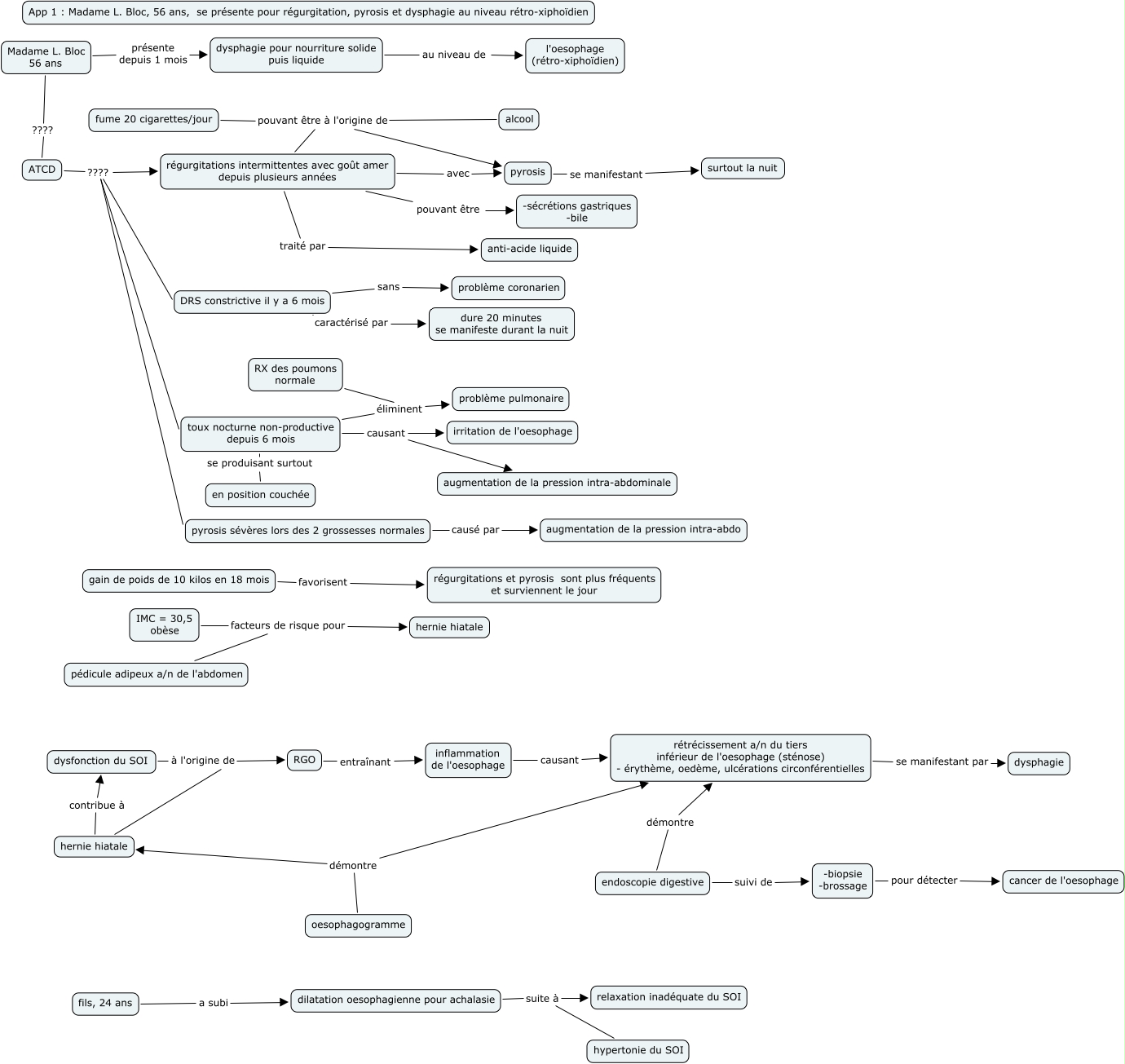 This Concept Map, created with IHMC CmapTools, has information related to: App 1 naïf, pédicule adipeux a/n de l'abdomen facteurs de risque pour hernie hiatale, endoscopie digestive démontre rétrécissement a/n du tiers inférieur de l'oesophage (sténose) - érythème, oedème, ulcérations circonférentielles, oesophagogramme démontre hernie hiatale, IMC = 30,5 obèse facteurs de risque pour hernie hiatale, toux nocturne non-productive depuis 6 mois éliminent problème pulmonaire, RX des poumons normale éliminent problème pulmonaire, inflammation de l'oesophage causant rétrécissement a/n du tiers inférieur de l'oesophage (sténose) - érythème, oedème, ulcérations circonférentielles, ATCD ???? toux nocturne non-productive depuis 6 mois, alcool pouvant être à l'origine de régurgitations intermittentes avec goût amer depuis plusieurs années, alcool pouvant être à l'origine de pyrosis, oesophagogramme démontre rétrécissement a/n du tiers inférieur de l'oesophage (sténose) - érythème, oedème, ulcérations circonférentielles, dilatation oesophagienne pour achalasie suite à relaxation inadéquate du SOI, dysfonction du SOI à l'origine de RGO, régurgitations intermittentes avec goût amer depuis plusieurs années avec pyrosis, toux nocturne non-productive depuis 6 mois se produisant surtout en position couchée, Madame L. Bloc 56 ans présente depuis 1 mois dysphagie pour nourriture solide puis liquide, hernie hiatale contribue à dysfonction du SOI, pyrosis sévères lors des 2 grossesses normales causé par augmentation de la pression intra-abdo, fils, 24 ans a subi dilatation oesophagienne pour achalasie, Madame L. Bloc 56 ans ???? ATCD