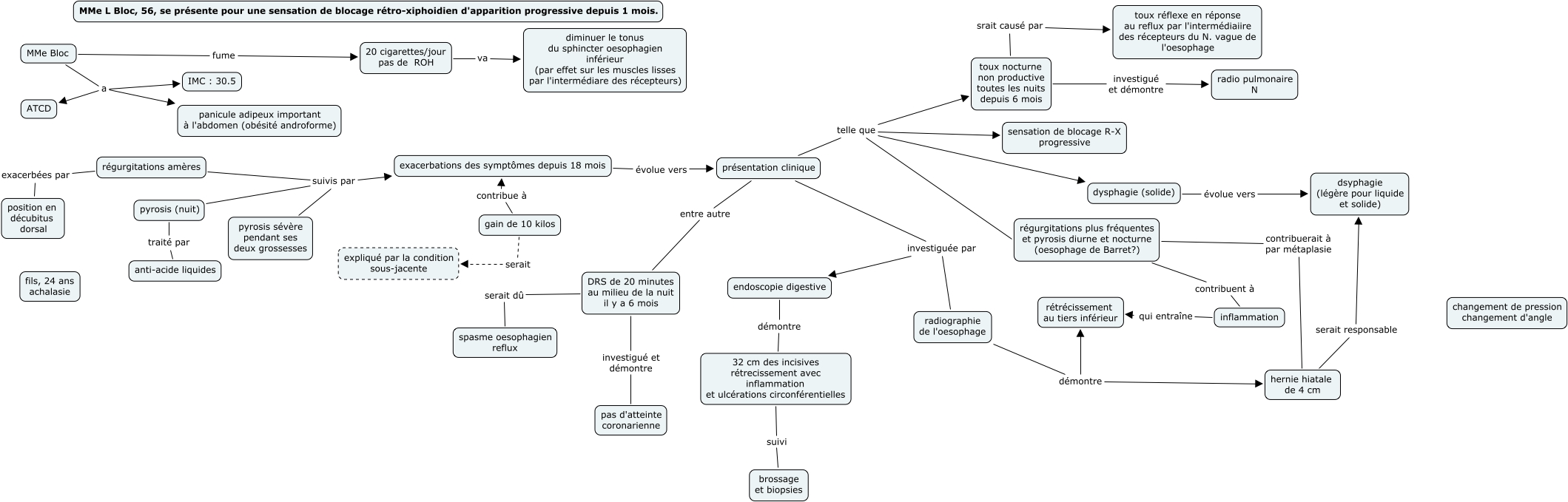 This Concept Map, created with IHMC CmapTools, has information related to: app 1 - brouillon -, régurgitations plus fréquentes et pyrosis diurne et nocturne (oesophage de Barret?) contribuent à inflammation, présentation clinique telle que régurgitations plus fréquentes et pyrosis diurne et nocturne (oesophage de Barret?), présentation clinique telle que sensation de blocage R-X progressive, gain de 10 kilos serait expliqué par la condition sous-jacente, présentation clinique entre autre DRS de 20 minutes au milieu de la nuit il y a 6 mois, régurgitations amères exacerbées par position en décubitus dorsal, pyrosis (nuit) suivis par exacerbations des symptômes depuis 18 mois, 20 cigarettes/jour pas de ROH va diminuer le tonus du sphincter oesophagien inférieur (par effet sur les muscles lisses par l'intermédiare des récepteurs), exacerbations des symptômes depuis 18 mois évolue vers présentation clinique, endoscopie digestive démontre 32 cm des incisives rétrecissement avec inflammation et ulcérations circonférentielles, DRS de 20 minutes au milieu de la nuit il y a 6 mois serait dû spasme oesophagien reflux, inflammation qui entraîne rétrécissement au tiers inférieur, MMe Bloc a ATCD, radiographie de l'oesophage démontre rétrécissement au tiers inférieur, présentation clinique investiguée par endoscopie digestive, MMe Bloc a IMC : 30.5, hernie hiatale de 4 cm serait responsable dsyphagie (légère pour liquide et solide), pyrosis sévère pendant ses deux grossesses suivis par exacerbations des symptômes depuis 18 mois, régurgitations plus fréquentes et pyrosis diurne et nocturne (oesophage de Barret?) contribuerait à par métaplasie hernie hiatale de 4 cm, présentation clinique telle que toux nocturne non productive toutes les nuits depuis 6 mois