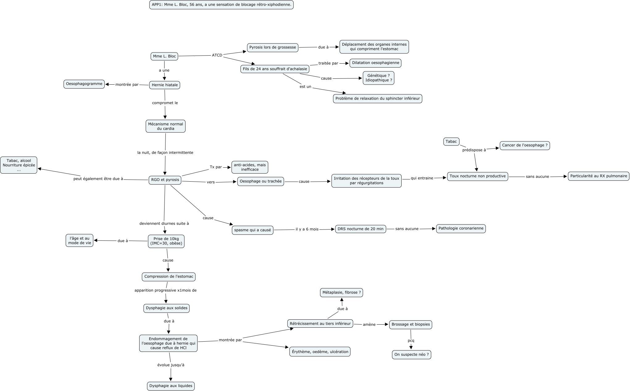 This Concept Map, created with IHMC CmapTools, has information related to: APP1, Fils de 24 ans souffrait d'achalasie cause Génétique ? Idiopathique ?, Hernie hiatale montrée par Oesophagogramme, RGO et pyrosis vers Oesophage ou trachée, Hernie hiatale compromet le Mécanisme normal du cardia, Mécanisme normal du cardia la nuit, de façon intermittente RGO et pyrosis, Prise de 10kg (IMC=30, obèse) due à l'âge et au mode de vie, RGO et pyrosis deviennent diurnes suite à Prise de 10kg (IMC=30, obèse), Rétrécissement au tiers inférieur amène Brossage et biopsies, Tabac prédispose à Cancer de l'oesophage ?, Mme L. Bloc ATCD Fils de 24 ans souffrait d'achalasie, RGO et pyrosis Tx par anti-acides, mais inefficace, Endommagement de l'oesophage due à hernie qui cause reflux de HCl évolue jusqu'à Dysphagie aux liquides, RGO et pyrosis cause spasme qui a causé, Mme L. Bloc ATCD Pyrosis lors de grossesse, RGO et pyrosis peut également être due à Tabac, alcool Nourriture épicée ..., Endommagement de l'oesophage due à hernie qui cause reflux de HCl montrée par Rétrécissement au tiers inférieur, Pyrosis lors de grossesse due à Déplacement des organes internes qui compriment l'estomac, Brossage et biopsies pcq On suspecte néo ?, Compression de l'estomac apparition progressive x1mois de Dysphagie aux solides, Fils de 24 ans souffrait d'achalasie traitée par Dilatation oesophagienne