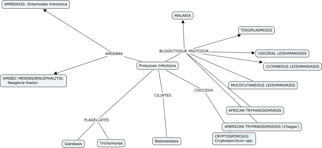 Protozoan Infections, Protozoan Infections AMOEBAE AMEBIC MENINGOENCEPHALITIS: Naegleria fowleri, Protozoan Infections BLOOD/TISSUE PROTOZOA VISCERAL LEISHMANIASIS, Protozoan Infections BLOOD/TISSUE PROTOZOA MALARIA, Protozoan Infections BLOOD/TISSUE PROTOZOA AFRICAN TRYPANOSOMIASIS, Protozoan Infections BLOOD/TISSUE PROTOZOA MUCOCUTANEOUS LEISHMANIASIS, Protozoan Infections FLAGELLATES Giardiasis, Protozoan Infections FLAGELLATES Trichomonas, Protozoan Infections BLOOD/TISSUE PROTOZOA TOXOPLASMOSIS, Protozoan Infections BLOOD/TISSUE PROTOZOA CUTANEOUS LEISHMANIASIS, Protozoan Infections COCCIDIA CRYPTOSPOROSIS: Cryptosporidium spp.