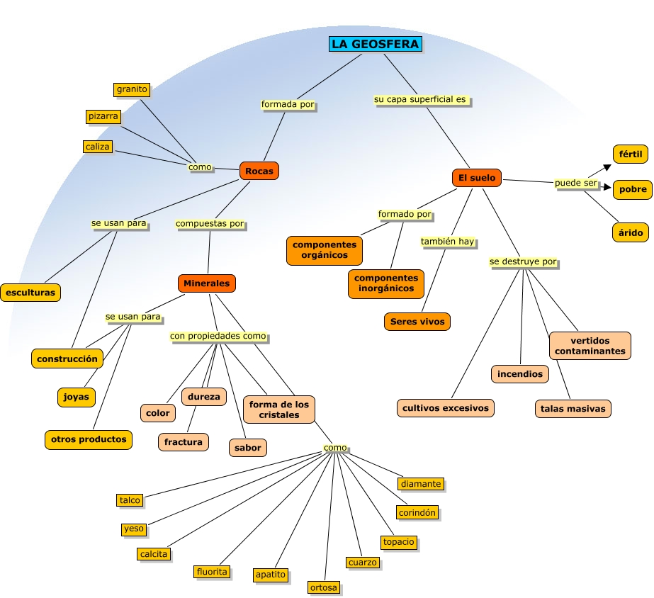 La geosfera(I), Rocas se usan para esculturas, El suelo se destruye por vertidos contaminantes, Rocas compuestas por Minerales, Minerales como apatito, El suelo formado por componentes orgánicos, Rocas se usan para construcción, Minerales con propiedades como color, Minerales se usan para construcción, LA GEOSFERA su capa superficial es El suelo, Minerales como fluorita