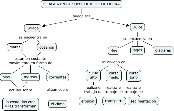 Este mapa conceptual tiene información relacionada a: lorenzo ortiz, curso medio realiza el trabajo de transporte, océanos estan en costante movimiento en forma de mareas, mares estan en costante movimiento en forma de olas, océanos estan en costante movimiento en forma de corrientes, Dulce se encuentra en lagos, EL AGUA EN LA SUPERFICIE DE LA TIERRA puede ser Dulce, Salada se encuentra en océanos, Dulce se encuentra en ríos, EL AGUA EN LA SUPERFICIE DE LA TIERRA puede ser Salada, corrientes atúan sobre el clima