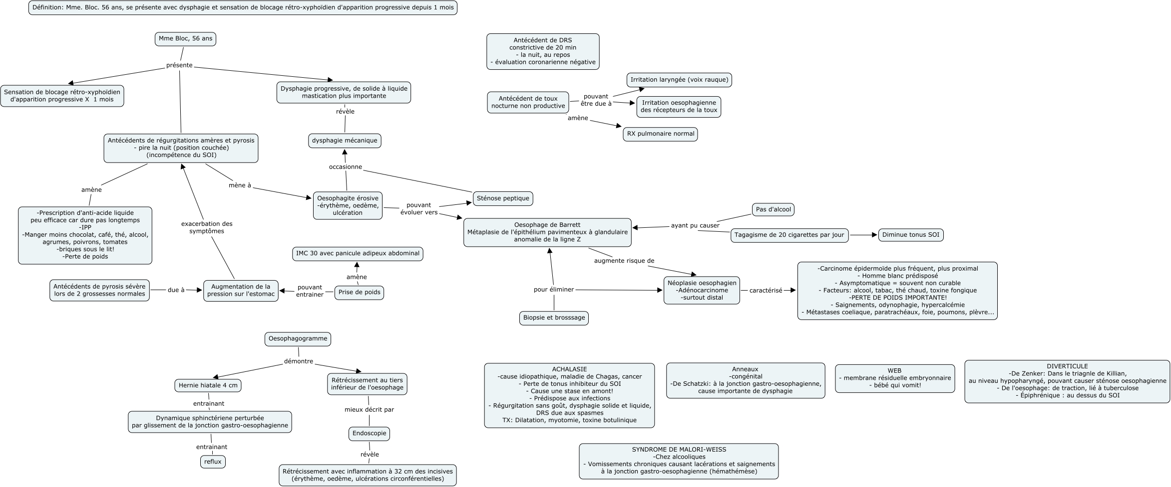 This Concept Map, created with IHMC CmapTools, has information related to: Untitled, Sténose peptique occasionne dysphagie mécanique, Mme Bloc, 56 ans présente Antécédents de régurgitations amères et pyrosis - pire la nuit (position couchée) (incompétence du SOI), Oesophagite érosive -érythème, oedème, ulcération pouvant évoluer vers Sténose peptique, Antécédent de toux nocturne non productive pouvant être due à Irritation laryngée (voix rauque), Oesophagogramme démontre Rétrécissement au tiers inférieur de l'oesophage, Biopsie et brosssage pour éliminer Oesophage de Barrett Métaplasie de l'épithélium pavimenteux à glandulaire anomalie de la ligne Z, Néoplasie oesophagien -Adénocarcinome -surtout distal caractérisé -Carcinome épidermoïde plus fréquent, plus proximal - Homme blanc prédisposé - Asymptomatique = souvent non curable - Facteurs: alcool, tabac, thé chaud, toxine fongique -PERTE DE POIDS IMPORTANTE! - Saignements, odynophagie, hypercalcémie - Métastases coeliaque, paratrachéaux, foie, poumons, plèvre..., Mme Bloc, 56 ans présente Sensation de blocage rétro-xyphoïdien d'apparition progressive X 1 mois, Tagagisme de 20 cigarettes par jour ???? Diminue tonus SOI, Oesophage de Barrett Métaplasie de l'épithélium pavimenteux à glandulaire anomalie de la ligne Z augmente risque de Néoplasie oesophagien -Adénocarcinome -surtout distal, Antécédents de pyrosis sévère lors de 2 grossesses normales due à Augmentation de la pression sur l'estomac, Antécédent de toux nocturne non productive pouvant être due à Irritation oesophagienne des récepteurs de la toux, Dysphagie progressive, de solide à liquide mastication plus importante révèle dysphagie mécanique, Antécédents de régurgitations amères et pyrosis - pire la nuit (position couchée) (incompétence du SOI) amène -Prescription d'anti-acide liquide peu efficace car dure pas longtemps -IPP -Manger moins chocolat, café, thé, alcool, agrumes, poivrons, tomates -briques sous le lit! -Perte de poids, Prise de poids amène IMC 30 avec panicule adipeux abdominal, Augmentation de la pression sur l'estomac exacerbation des symptômes Antécédents de régurgitations amères et pyrosis - pire la nuit (position couchée) (incompétence du SOI), Oesophagogramme démontre Hernie hiatale 4 cm, Antécédent de toux nocturne non productive amène RX pulmonaire normal, Tagagisme de 20 cigarettes par jour ayant pu causer Oesophage de Barrett Métaplasie de l'épithélium pavimenteux à glandulaire anomalie de la ligne Z, Dynamique sphinctériene perturbée par glissement de la jonction gastro-oesophagienne entrainant reflux