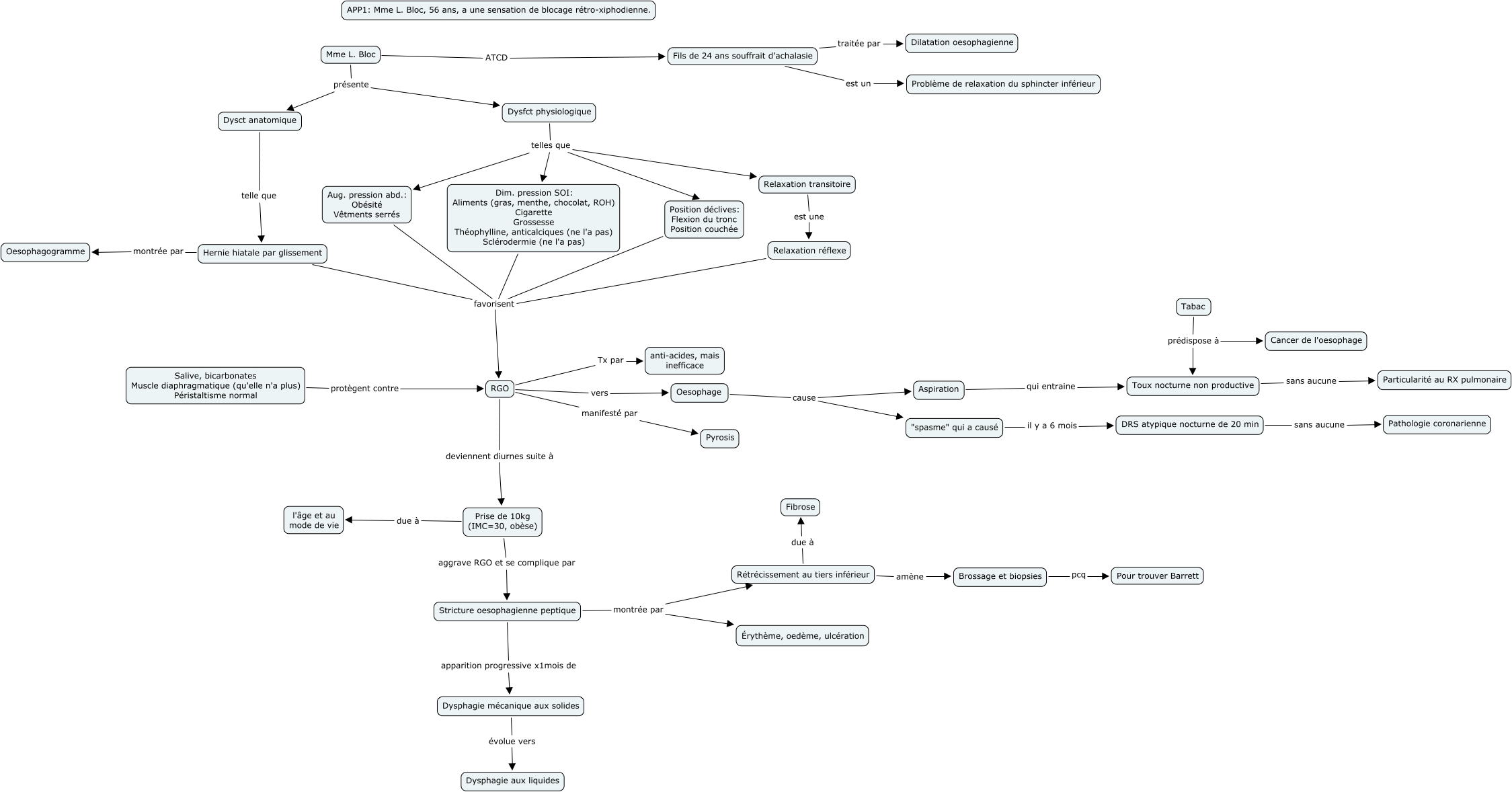 This Concept Map, created with IHMC CmapTools, has information related to: APP1-retour, RGO vers Oesophage, Hernie hiatale par glissement montrée par Oesophagogramme, Dim. pression SOI: Aliments (gras, menthe, chocolat, ROH) Cigarette Grossesse Théophylline, anticalciques (ne l'a pas) Sclérodermie (ne l'a pas) favorisent RGO, RGO deviennent diurnes suite à Prise de 10kg (IMC=30, obèse), Prise de 10kg (IMC=30, obèse) due à l'âge et au mode de vie, Dysct anatomique telle que Hernie hiatale par glissement, Rétrécissement au tiers inférieur amène Brossage et biopsies, Tabac prédispose à Cancer de l'oesophage, RGO Tx par anti-acides, mais inefficace, Mme L. Bloc ATCD Fils de 24 ans souffrait d'achalasie, Dysfct physiologique telles que Relaxation transitoire, Mme L. Bloc présente Dysct anatomique, Hernie hiatale par glissement favorisent RGO, Dysphagie mécanique aux solides évolue vers Dysphagie aux liquides, Stricture oesophagienne peptique montrée par Rétrécissement au tiers inférieur, Position déclives: Flexion du tronc Position couchée favorisent RGO, Dysfct physiologique telles que Aug. pression abd.: Obésité Vêtments serrés, Relaxation réflexe favorisent RGO, Stricture oesophagienne peptique apparition progressive x1mois de Dysphagie mécanique aux solides, Relaxation transitoire est une Relaxation réflexe