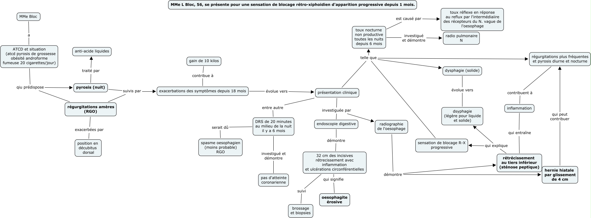 This Concept Map, created with IHMC CmapTools, has information related to: app 1, pyrosis (nuit) traité par anti-acide liquides, DRS de 20 minutes au milieu de la nuit il y a 6 mois investigué et démontre pas d'atteinte coronarienne, pyrosis (nuit) suivis par exacerbations des symptômes depuis 18 mois, rétrécissement au tiers inférieur (sténose peptique) qui explique sensation de blocage R-X progressive, régurgitations amères (RGO) suivis par exacerbations des symptômes depuis 18 mois, présentation clinique entre autre DRS de 20 minutes au milieu de la nuit il y a 6 mois, exacerbations des symptômes depuis 18 mois évolue vers présentation clinique, toux nocturne non productive toutes les nuits depuis 6 mois investigué et démontre radio pulmonaire N, 32 cm des incisives rétrecissement avec inflammation et ulcérations circonférentielles suivi brossage et biopsies, gain de 10 kilos contribue à exacerbations des symptômes depuis 18 mois, endoscopie digestive démontre 32 cm des incisives rétrecissement avec inflammation et ulcérations circonférentielles, présentation clinique telle que sensation de blocage R-X progressive, présentation clinique telle que régurgitations plus fréquentes et pyrosis diurne et nocturne, régurgitations plus fréquentes et pyrosis diurne et nocturne contribuent à inflammation, hernie hiatale par glissement de 4 cm qui peut contribuer régurgitations plus fréquentes et pyrosis diurne et nocturne, présentation clinique telle que toux nocturne non productive toutes les nuits depuis 6 mois, toux nocturne non productive toutes les nuits depuis 6 mois est causé par toux réflexe en réponse au reflux par l'intermédiaiire des récepteurs du N. vague de l'oesophage, radiographie de l'oesophage démontre hernie hiatale par glissement de 4 cm, DRS de 20 minutes au milieu de la nuit il y a 6 mois serait dû spasme oesophagien (moins probable) RGO, régurgitations amères (RGO) exacerbées par position en décubitus dorsal