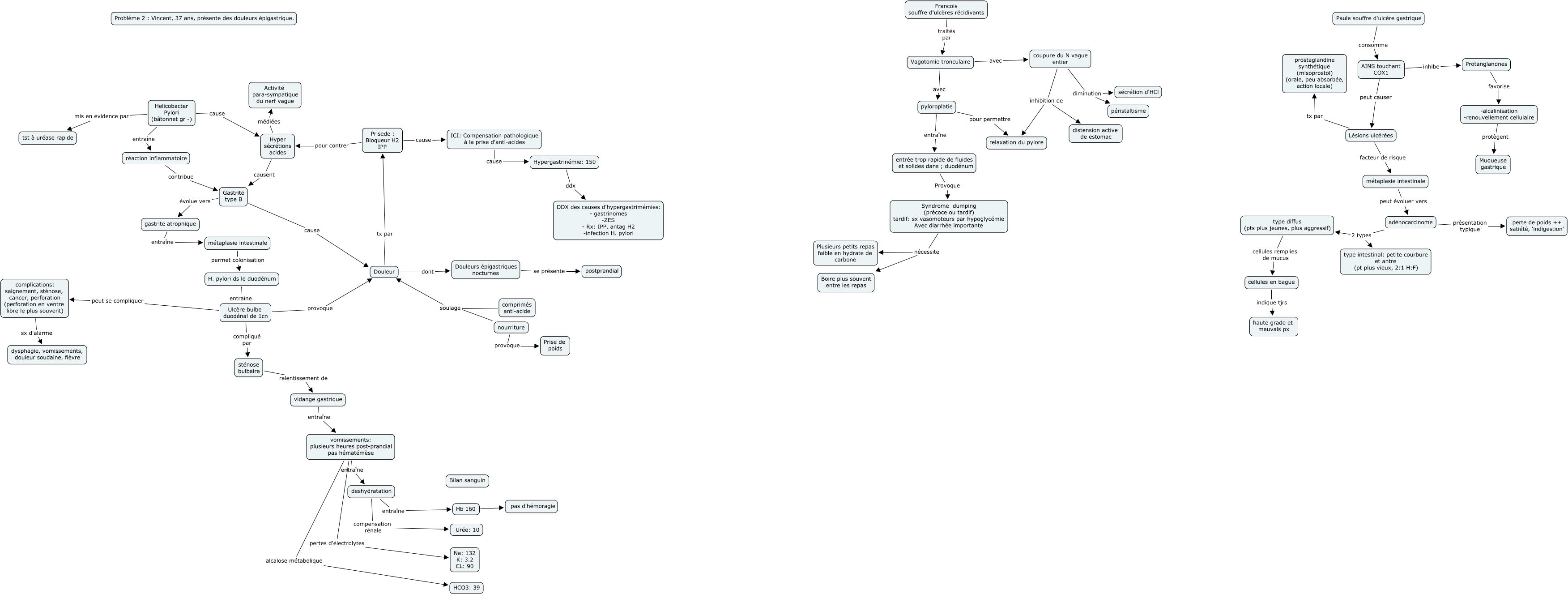 This Concept Map, created with IHMC CmapTools, has information related to: APP 2 allé, Helicobacter Pylori (bâtonnet gr -) mis en évidence par tst à uréase rapide, Protanglandnes favorise -alcalinisation -renouvellement cellulaire, Prisede : Bloqueur H2 IPP cause ICI: Compensation pathologique à la prise d'anti-acides, Douleur tx par Prisede : Bloqueur H2 IPP, Prisede : Bloqueur H2 IPP pour contrer Hyper sécrétions acides, deshydratation compensation rénale Urée: 10, Syndrome dumping (précoce ou tardif) tardif: sx vasomoteurs par hypoglycémie Avec diarrhée importante nécessite Plusieurs petits repas faible en hydrate de carbone, Vagotomie tronculaire avec coupure du N vague entier, ICI: Compensation pathologique à la prise d'anti-acides cause Hypergastrinémie: 150, Ulcère bulbe duodénal de 1cn peut se compliquer complications: saignement, sténose, cancer, perforation (perforation en ventre libre le plus souvent), -alcalinisation -renouvellement cellulaire protègent Muqueuse gastrique, Gastrite type B cause Douleur, adénocarcinome 2 types type diffus (pts plus jeunes, plus aggressif), nourriture soulage Douleur, cellules en bague indique tjrs haute grade et mauvais px, Hypergastrinémie: 150 ddx DDX des causes d'hypergastrimémies: - gastrinomes -ZES - Rx: IPP, antag H2 -infection H. pylori, Paule souffre d'ulcère gastrique consomme AINS touchant COX1, métaplasie intestinale permet colonisation H. pylori ds le duodénum, vidange gastrique entraîne vomissements: plusieurs heures post-prandial pas hématémèse, vomissements: plusieurs heures post-prandial pas hématémèse pertes d'électrolytes Na: 132 K: 3.2 CL: 90