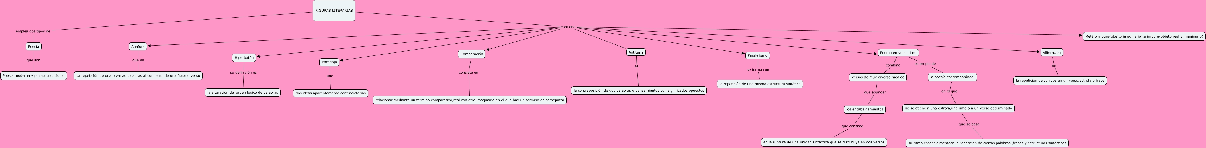 pepa(figuras literarias), FIGURAS LITERARIAS contiene Anáfora, FIGURAS LITERARIAS emplea dos tipos de Poesía, Antítesis es la contraposición de dos palabras o pensamientos con significados opuestos, Anáfora que es La repetición de una o varias palabras al comienzo de una frase o verso, Comparación consiste en relacionar mediante un término comparativo,real con otro imaginario en el que hay un termino de semejanza, versos de muy diversa medida que abundan los encabalgamientos, Paradoja une dos ideas aparentemente contradictorias, la poesía contemporánea en el que no se atiene a una estrofa,una rima o a un verso determinado, FIGURAS LITERARIAS contiene Comparación, FIGURAS LITERARIAS contiene Paradoja